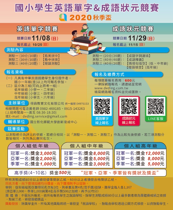 報名日期:英語單字即日起至109年10月25日(星期日)中午12時止、成語狀元即日起至109年11月15日(星期日)中午12時止,需完成繳費報名手續。 活動日期:英語單字競賽109年11月8日(星期日)、成語狀元競賽109年11月29日(星期日)。 詳細內容如附件及網站 https://deding.com.tw/index/activity/rule_c.html?id=48