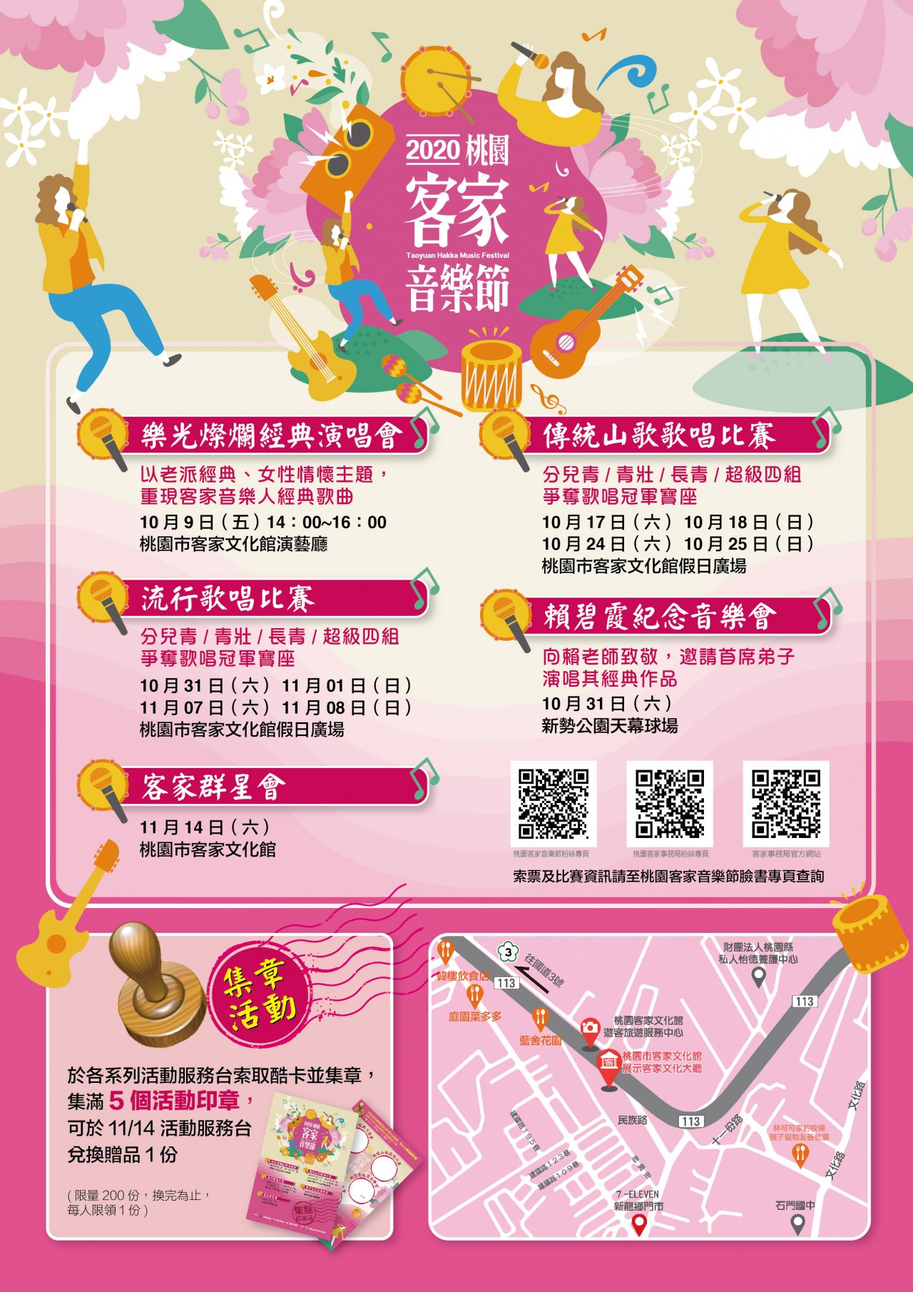 為推廣本市客家文化館典藏客家音樂人之音樂及作品,將客家流行音樂以不同風貌呈現,訂於109年10月9日(星期五)下午2時至4時假桃園市客家文化館演藝廳辦理辦理「2020桃園客家音樂節-樂光燦爛經典演唱會」,免費索票入場(索票資訊詳見活動文宣電子檔)