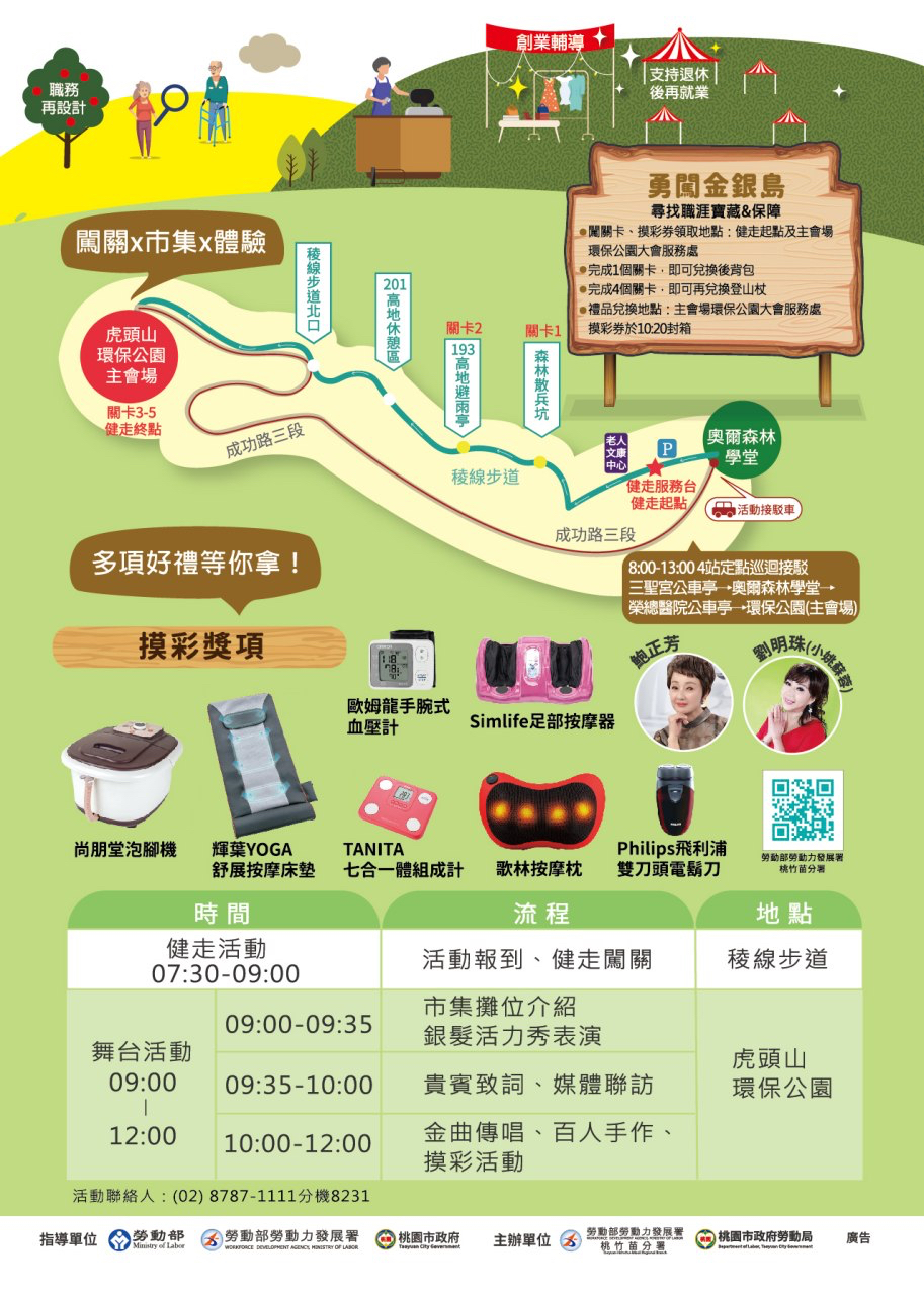 活動訂於109年10月24日(星期六)7時30分至12時假桃園虎頭山環保公園辦理,活動內容包含完成闖關可參加摸彩、市集攤位及銀髮活力秀、金曲傳唱等表演;另活動設有定點巡迴接駁車,歡迎參與民眾多加利用。