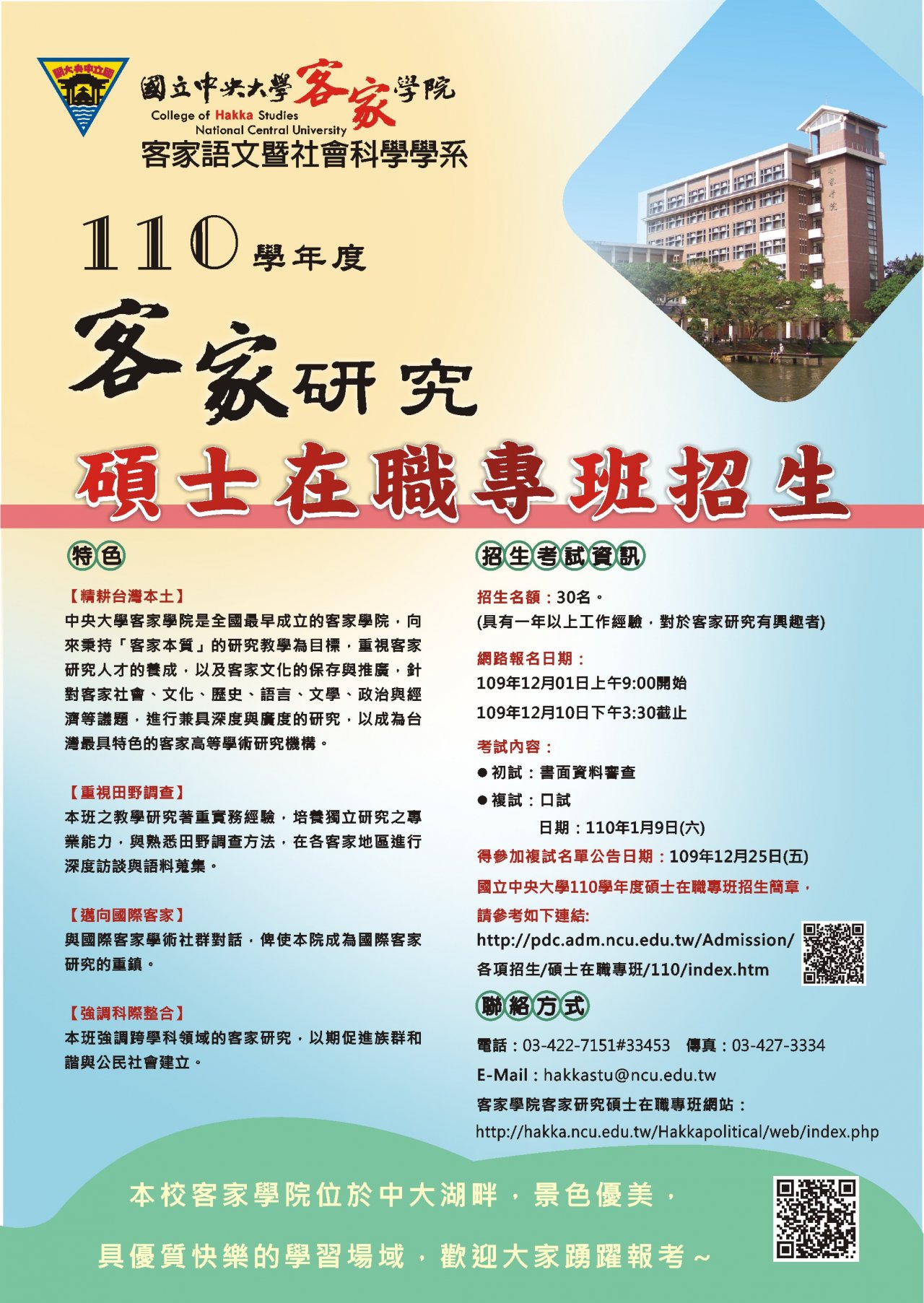 說明:依據國立中央大學109年11月5日中大客家字第1094200364號函辦理,檢附公文及相關附件。