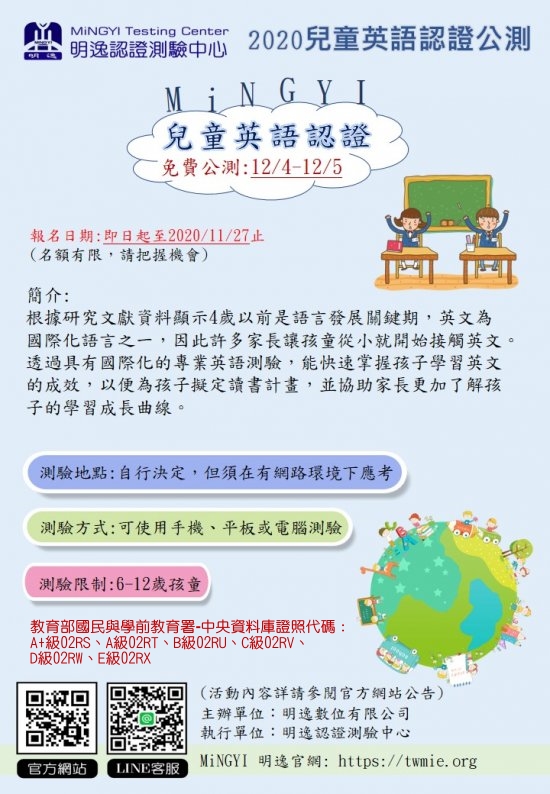 認證科目:兒童英語認證 MEC - MiNGYI English Certification for Young Learners (MYL)