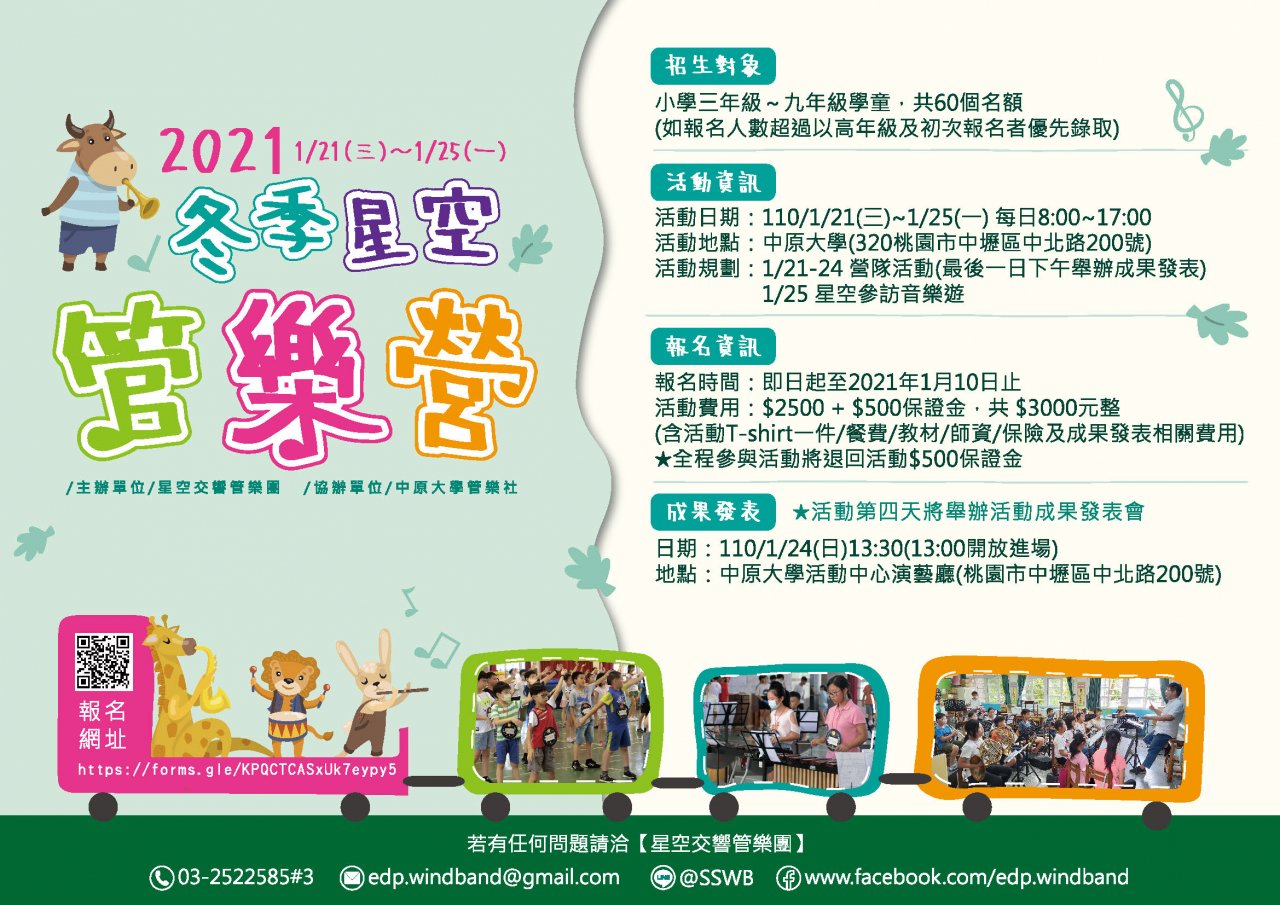 | 一、 | 營隊時間舉辦於110年1月21(星期四)至25日(星期一),每日早上8:00~下午5:00,活動地點於中原大學舉辦,1/24下午13:30假中原大學活動中心演藝廳舉辦營隊成果音樂會。 |
