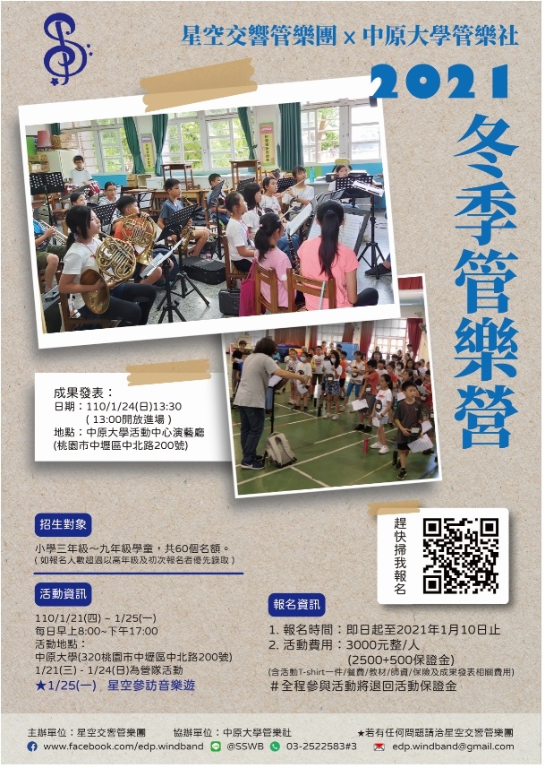 | 三、 | 營隊報名、活動及課程詳請可洽本團行政韋先生(電話:03-2522585#302、傳真:03-4910009),或是於Facebook粉絲專業搜尋「星空交響管樂團」及Line官方帳號:@sswb加入好友可以獲得更多相關資訊 |