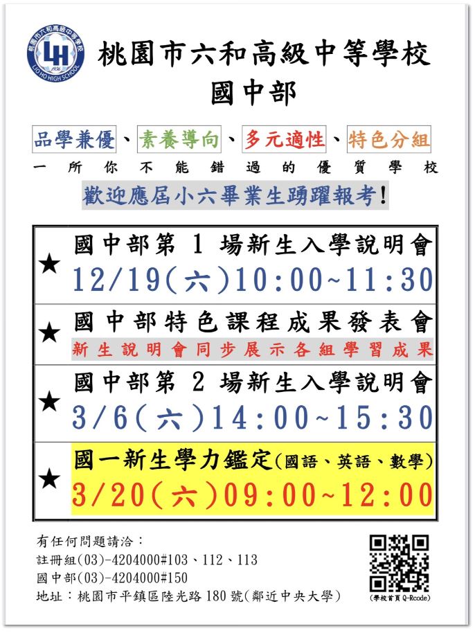 六和高中國中部110學年度國一新生入學說明會及學力鑑定時間表