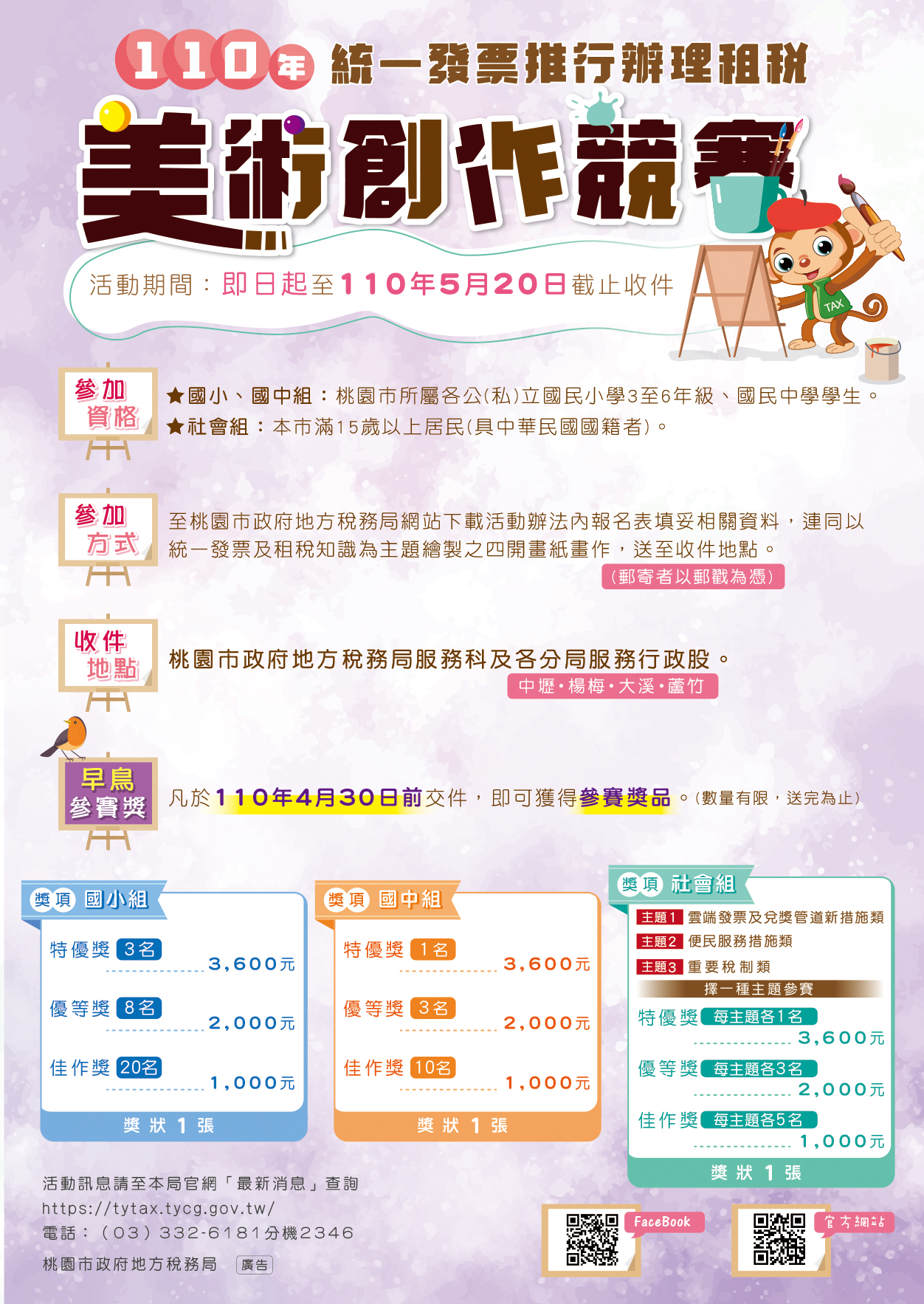 校內收件至5/19截止 辦理方式,詳如活動辦法,摘錄如下: (一) 畫作繪製內容:參賽者將統一發票兌獎管道新措施(含統一發票兌獎App)、購物消費索取統一發票、行動支付結合雲端發票、雲端發票自動化對獎、地方稅3大稅(房屋稅、使用牌照稅、地價稅)開徵訊息、國稅及地方稅種類、便民服務措施、多元化繳稅管道、稅收建設、重要稅制及稅政等為主題自訂題目,以繪畫方式呈現。 (二) 報名日期:即日起至110年5月20日止。 (三) 報名對象:桃園市所屬各公(私)立國民中學、國民小學3至6年級學生及本市滿15歲以上居民(具中華民國國籍者)。 (四) 報名方式:一律用四開畫紙繪製(直式、橫式皆可)完成後,請於收件截止日前自行送件(由本局掣發收據)或掛號(以作品寄出郵戳為憑)郵寄,即完成報名。 (五) 收件地點:本局服務科宣導股及各分局股務行政股。 (六) 早鳥參賽獎:凡於110年4月30日前交件,即可獲得參賽獎品。 (七) 參賽組別及獎項:分為國小組、國中組及社會組,得獎者核發獎金及本局獎狀以茲鼓勵(國中組得獎學生已列入12年國教超額比序競賽加分之依據,給分標準特優(6分)、優等(5分)、佳作(3分)),其獎項及名額如下: 1、國小組 (1) 特優獎3名:每名獎金3,600元、獎狀1張。 (2) 優等獎8名:每名獎金2,000元、獎狀1張。 (3) 佳作獎20名:每名獎金1,000元、獎狀1張。 2、國中組 (1) 特優獎1名:每名獎金3,600元、獎狀1張。 (2) 優等獎3名:每名獎金2,000元、獎狀1張。 (3) 佳作獎10名:每名獎金1,000元、獎狀1張。 3、社會組(分3組主題,擇一組題參賽) (1) 特優獎(每主題各1名):每名獎金3,600元、獎狀1張。 (2) 優等獎(每主題各3名):每名獎金2,000元、獎狀1張。 (3) 佳作獎(每主題各5名):每名獎金1,000元、獎狀1張。