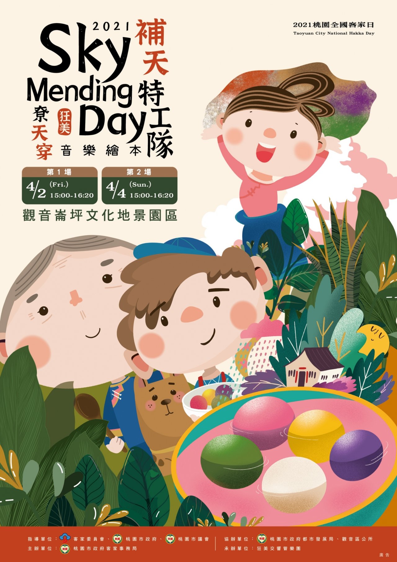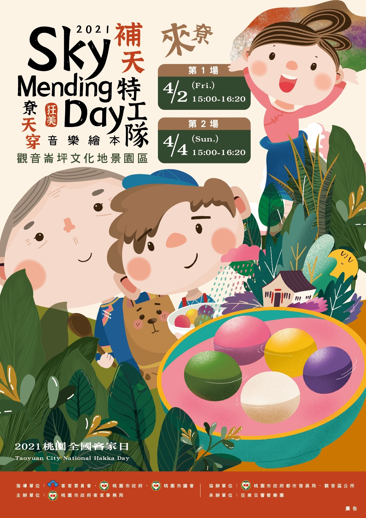 為歡度崙坪文化地景園區客家兒童日,邀請狂美交響管樂團於本(110)年4月2日及4月4日辦理親子音樂繪本展演「補天特工隊」,將結合趣味戲劇、全彩繪本、專業演唱及現場樂團演奏,獻上一齣富有客家文化意涵的親子音樂劇。