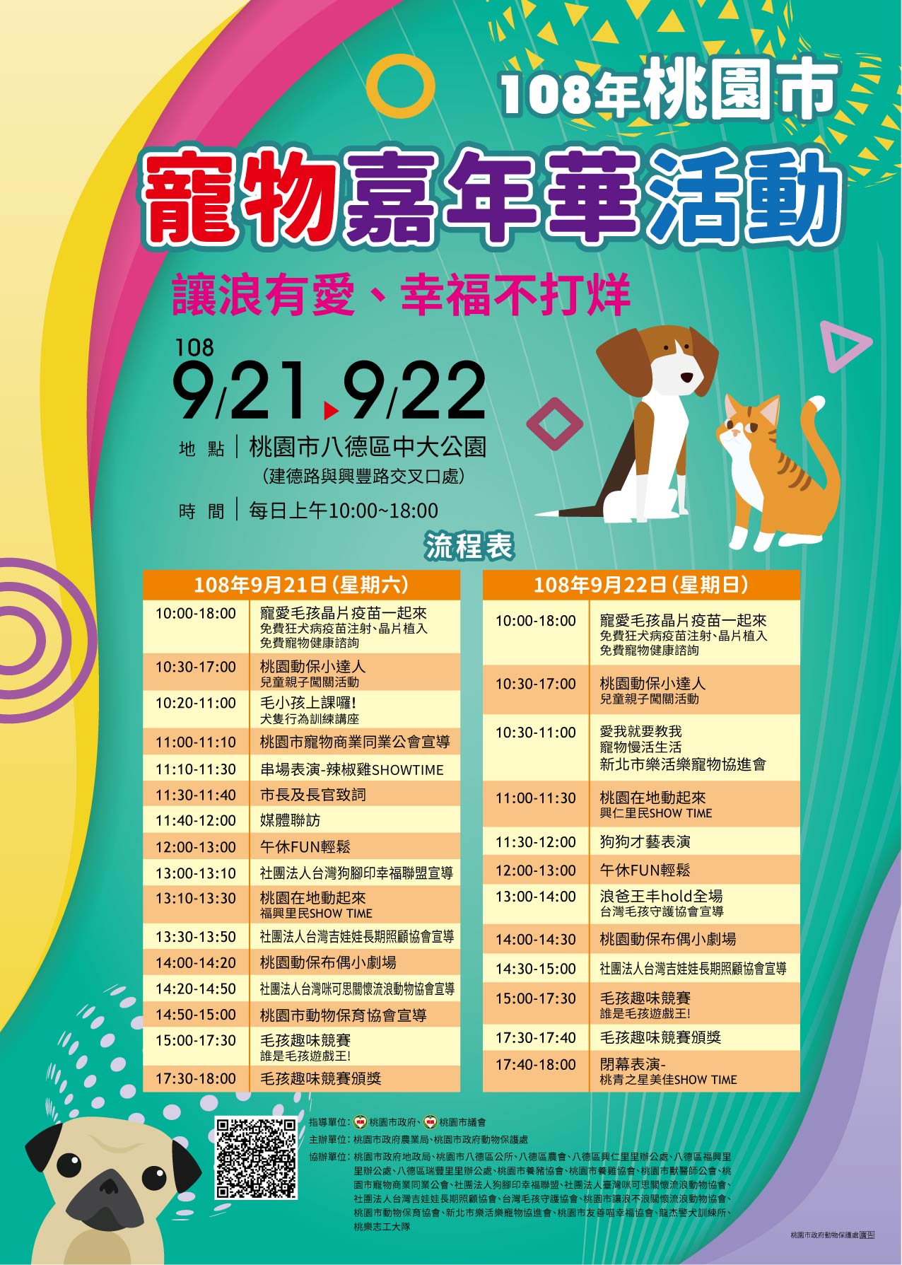 主旨:轉知本府動物保護處辦理「108年桃園市寵物嘉年華活動」相關資訊,請貴校鼓勵學生踴躍參加,請查照。 說明: 一、搭配本市地景藝術節,本府動物保護處於本市八德區中大公園辦理寵物嘉年華活動,期能透過活動宣導飼養管理知識、飼主責任教育以及正確的動物保護觀念。 二、旨揭活動時間及地點如下:108年9月21日(星期六)及9月22日(星期日)上午10時至下午6時假本市八德區中大公園舉辦。 三、本案若有相關問題,請逕洽本府動物保護處陳妙熏承辦人,電話:03-332-6742分機508。