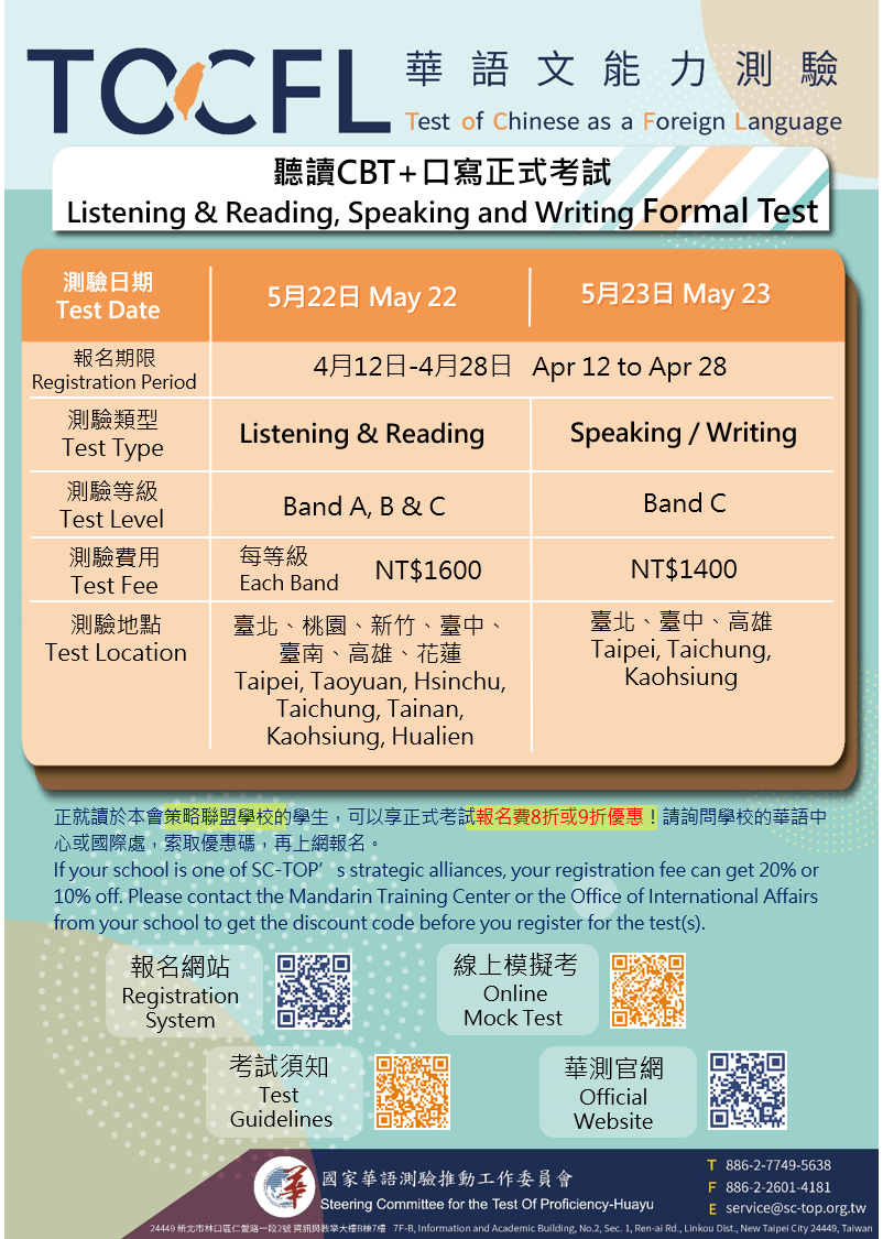 考試詳細資訊請參考官網最新消息:http://www.sc-top.org.tw/;或逕洽華測會考試推廣組(02)7749-5638轉8201-8205。