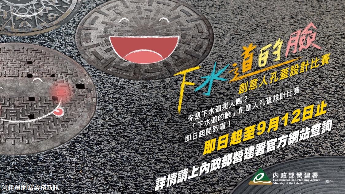 為推廣並建立民眾對於下水道建設的認識與了解,本署委託民視文化事業股份有限公司辦理「下水道的臉創意人孔設計比賽」,從110年8月16日至110年9月12日進行徵件,希望藉由下水道「人孔蓋—下水道的臉」作為主題,透過針對台灣民眾進行徵件比賽,以期在設計與創意中認識下水道建設並翻轉對下水道印象並能更認識下水道建設。