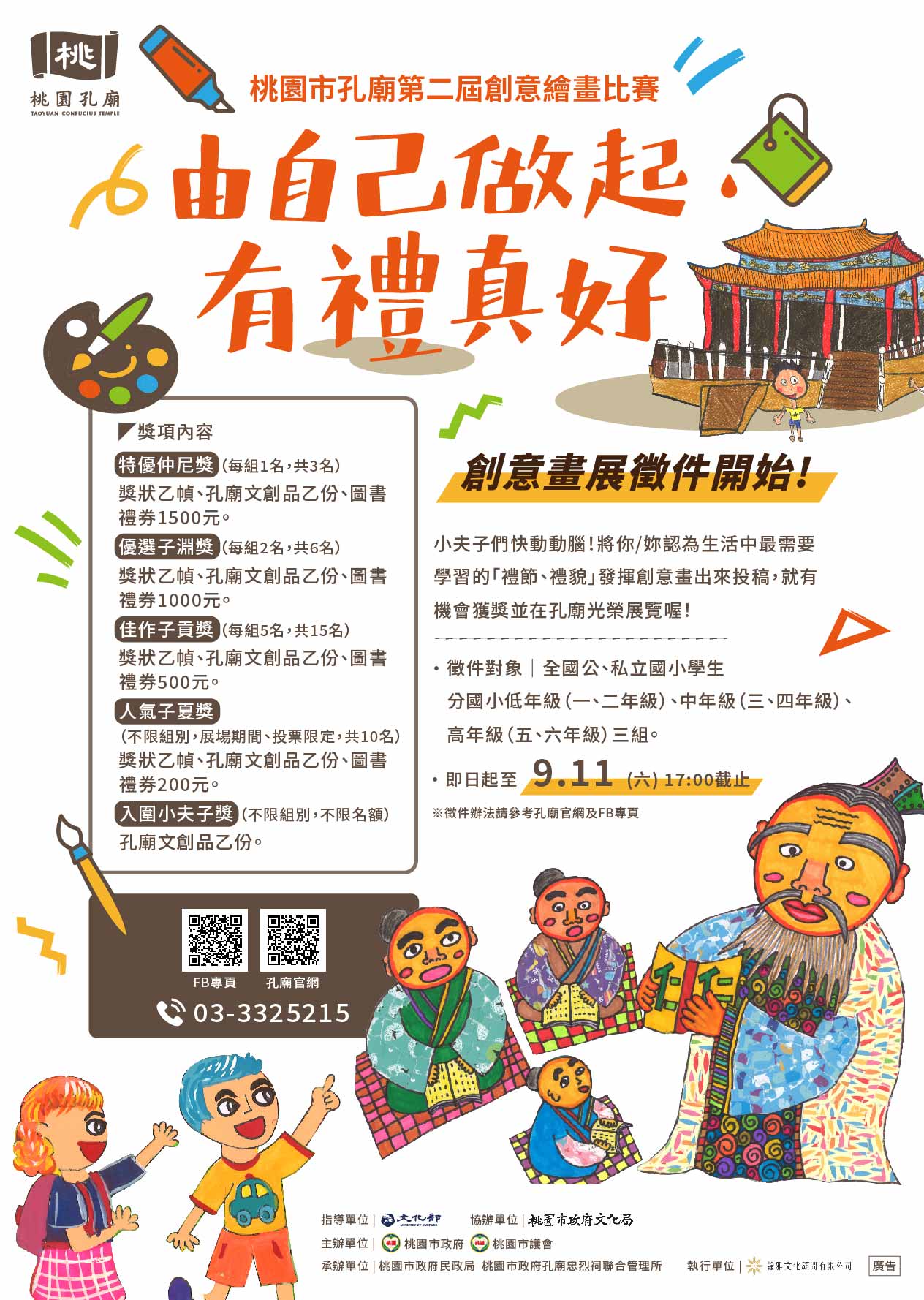 說明: 一、 旨揭活動徵件時間於110年7月19日至9月11日止,假桃園市孔廟(桃園市公園路42號)辦理。 二、 檢附110年桃園市孔廟第二屆創意繪畫比賽參賽辦法及報名資料、活動EDM供參,敬請協助列印宣傳,亦可於桃園市孔廟粉絲頁(網址:https://reurl.cc/bzo8q6)查詢詳細活動資訊。