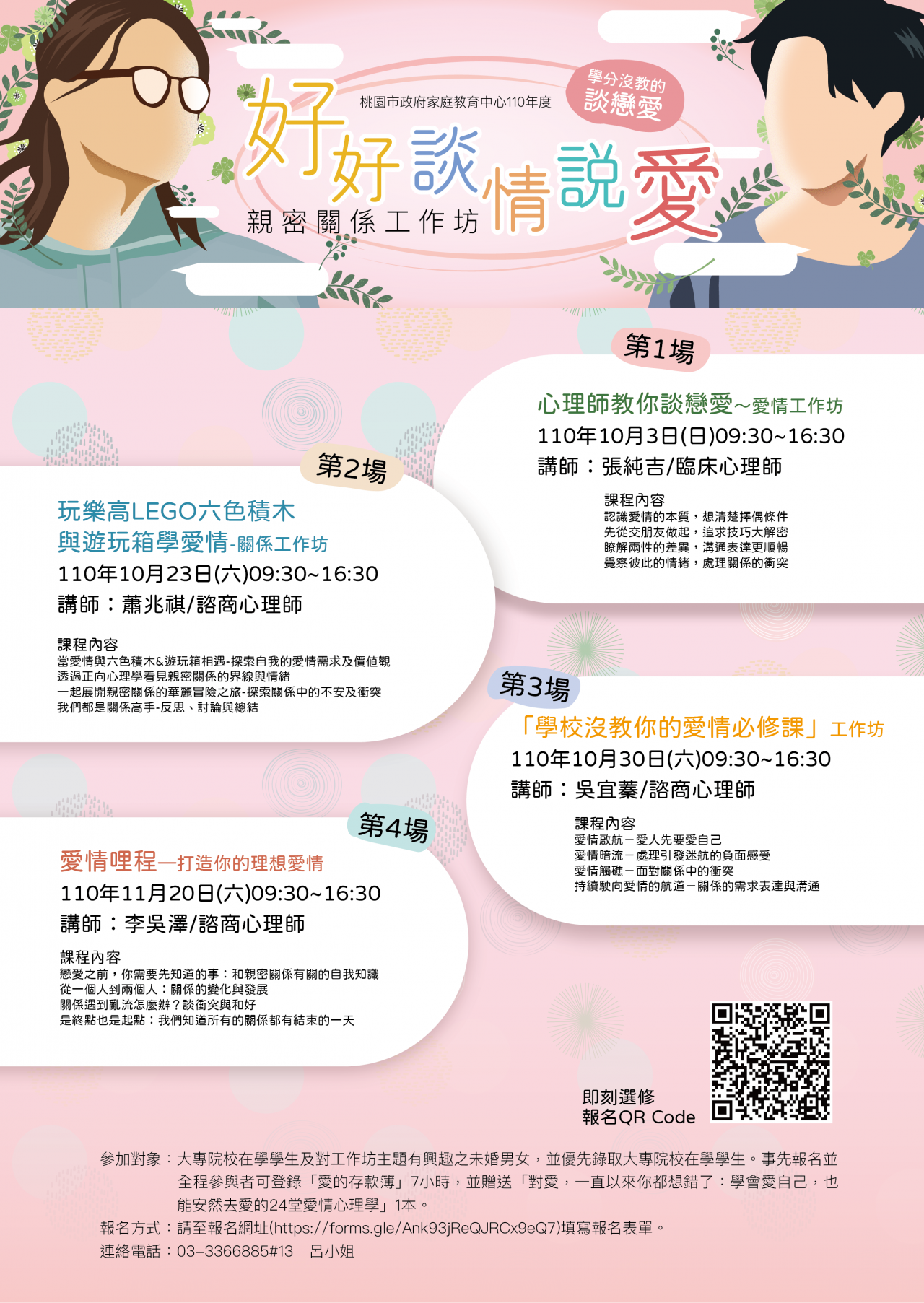 | 一、 | 依據桃園市政府家庭教育中心110年度「親密關係工作坊-好好談情說愛」實施計畫辦理。 |