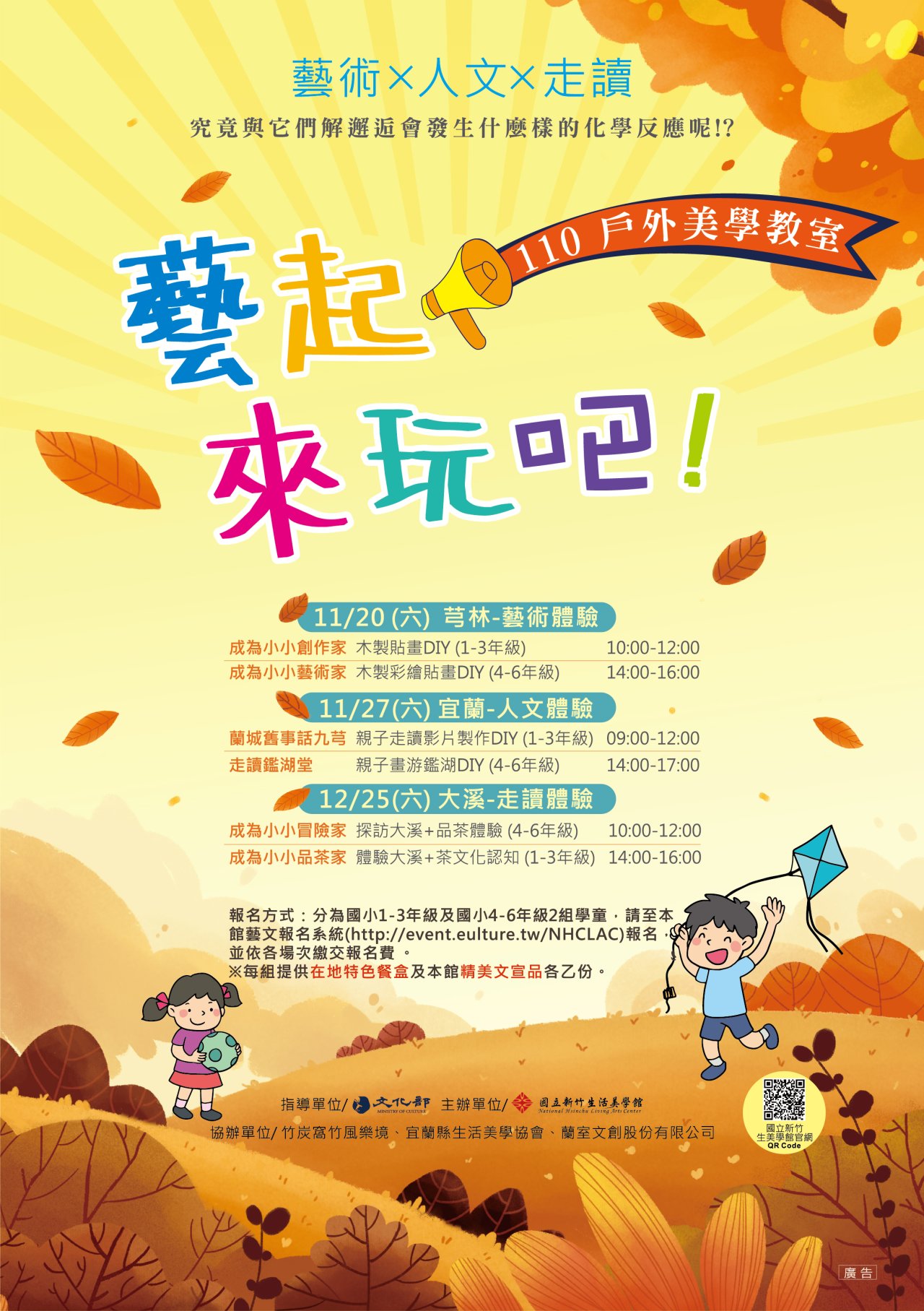 說明: 一、 本館規畫戶外美學教室「藝起來玩吧!」課程,融合「藝術體驗」、「人文體驗」、「走讀體驗」與在地生活美學連結,為國小學童量身打造藝文美感體驗課程。 二、 為使藝文資源充份利用,落實文化平權,開放部分名額提供學校推薦經濟弱勢家庭學童參與,將免收報名費。 三、 詳細資訊請參閱活動網頁:https://reurl.cc/yeOdqa。