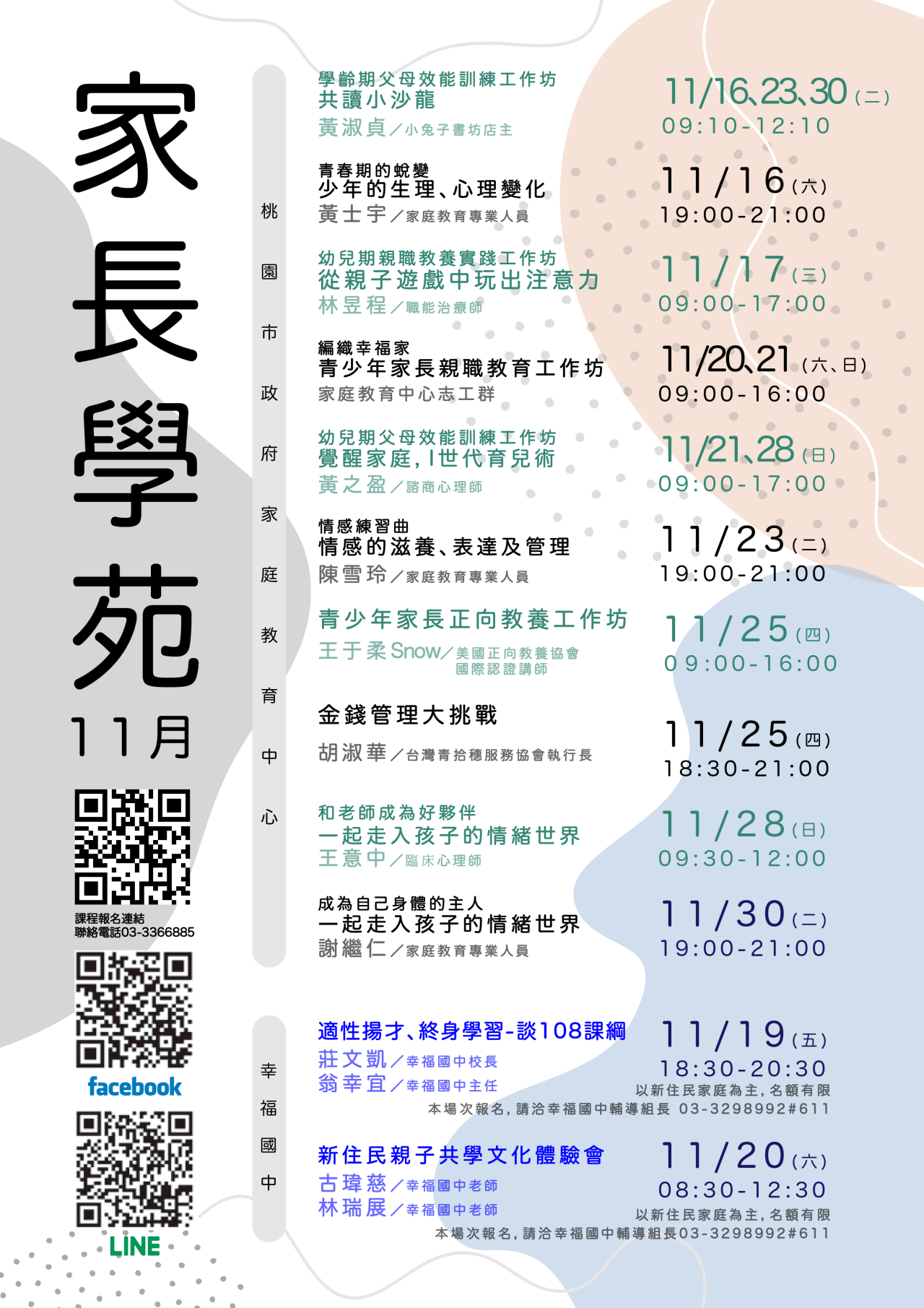 家庭教育中心11月份家長學苑課程資訊電子檔,鼓勵家長踴躍參加。