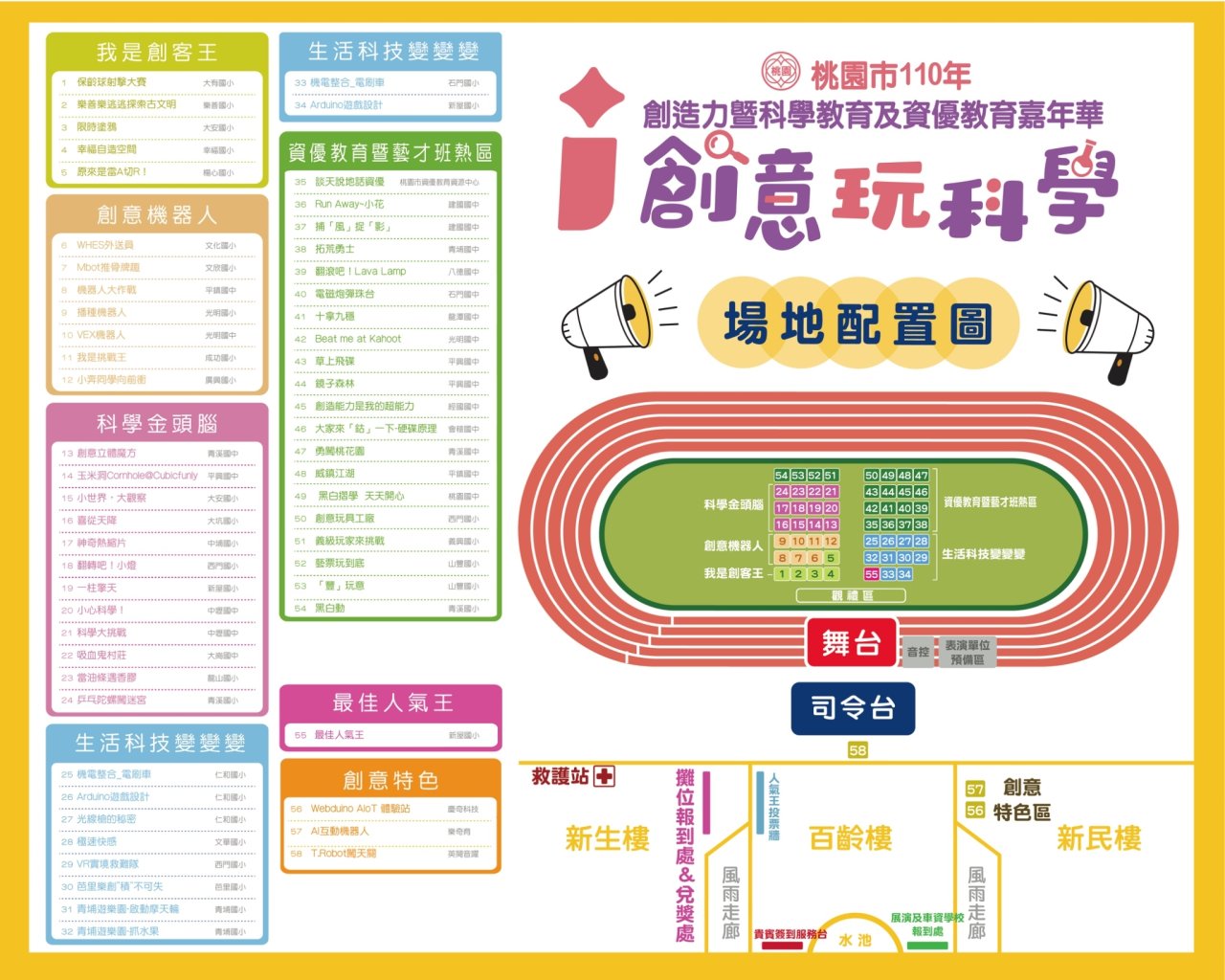 活動規劃摘錄如下: (一) 參加對象:本市公私立國中小學生、家長及教師。 (二) 時間地點:110年11月20日(星期六)上午8時30分至下午3時30分假新屋國小辦理。 (三) 活動規劃: 1、 頒獎典禮:表揚本市「110年度科學技能競賽-水火箭競賽」及「小力量大改變:國小科學基本能力競賽」獲獎學生及團隊,相關事宜另函通知。 2、 本市特色團隊表演。 3、 創意及資優教育闖關活動(計58攤位)。