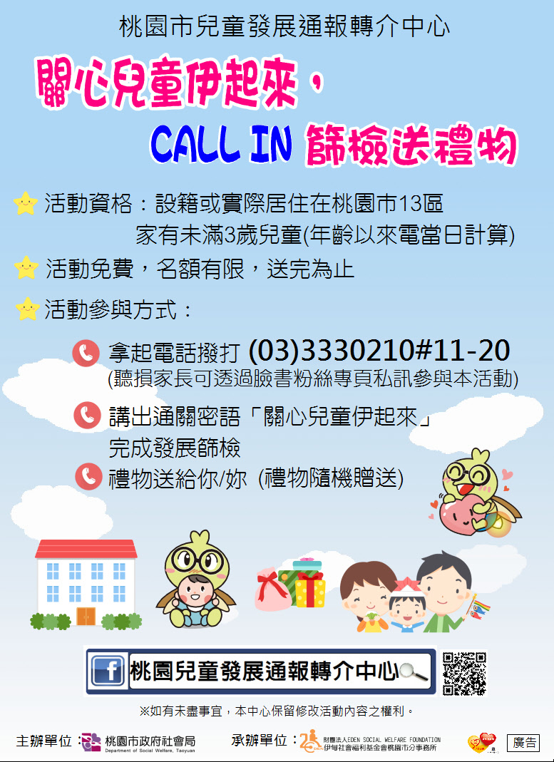 轉知:桃園市政府社會局委託桃園市兒童發展通報轉介中心辦理「關心兒童伊起來,CALL IN篩檢送禮物」活動