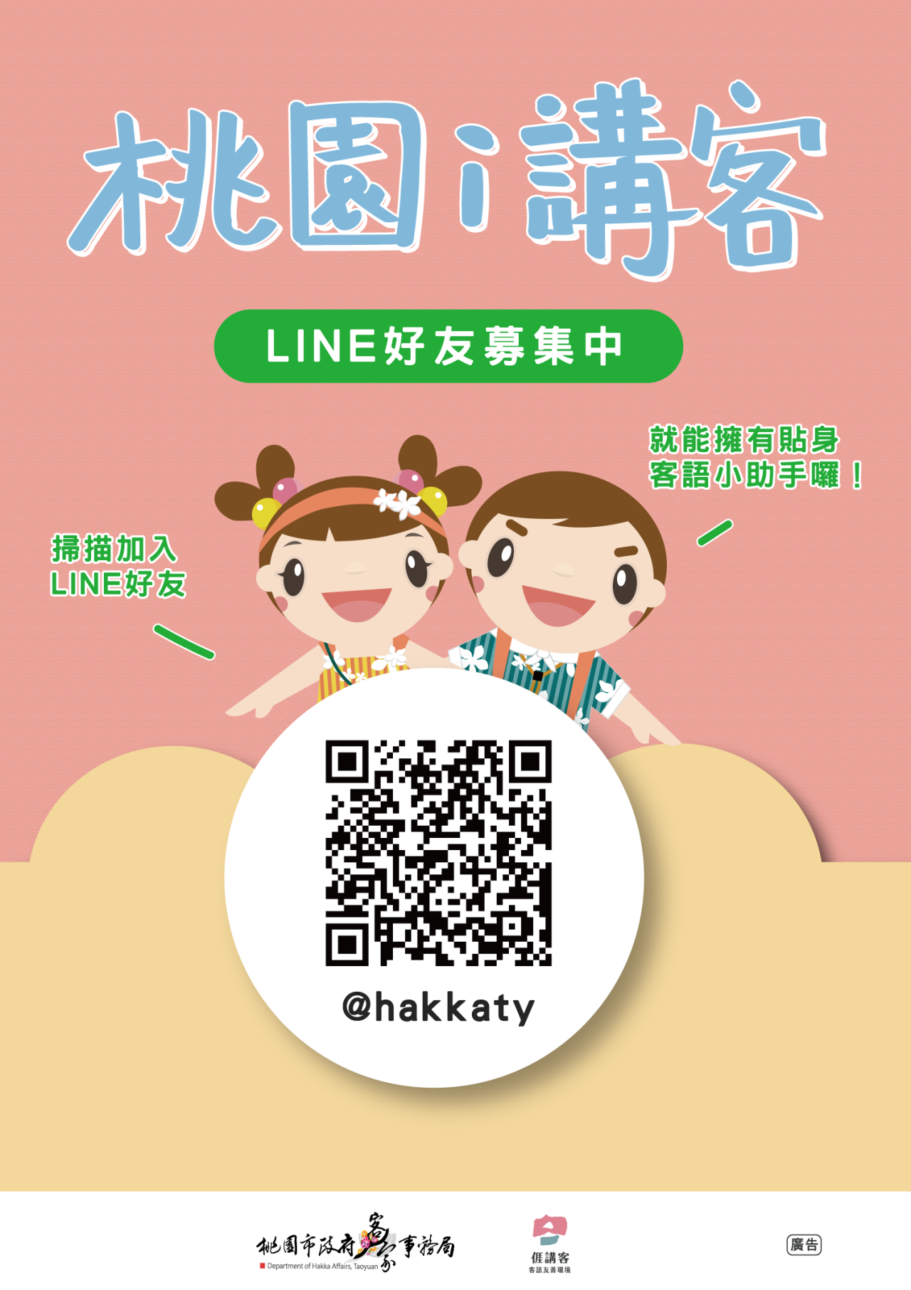 四、 鼓勵民眾加入「桃園i講客」LINE好友,可透過搜尋LINE ID「@hakkaty」、好友連結(https://lin.ee/tMnfGRL)、或是掃描QRCode等方式加入好友,邀請大家共下來學講客家話。