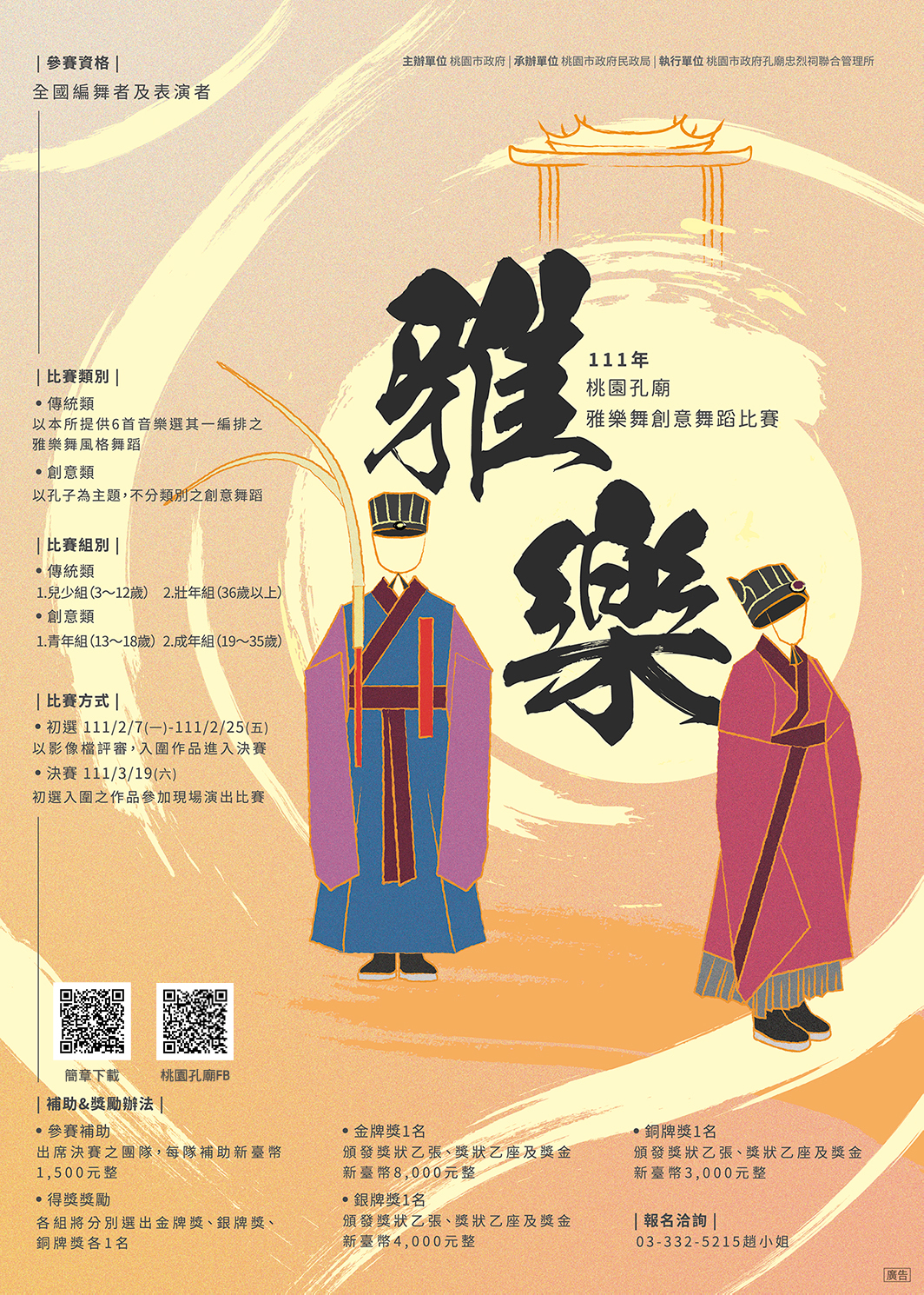 為促進孔廟特殊人文歷史藝術交流,提供創作舞蹈交流平台,推廣儒學特色,發揮藝文扎根的文化影響力,培育舞蹈創作人才,本所辦理「桃園市孔廟雅樂舞文化推廣活動-111年桃園孔廟雅樂舞創意舞蹈比賽活動」,活動徵件期間自111年2月7日至111年2月25日。 參加辦法及報名表下載連結:https://reurl.cc/mvWe0W,本案連絡人03-3325215趙小姐。