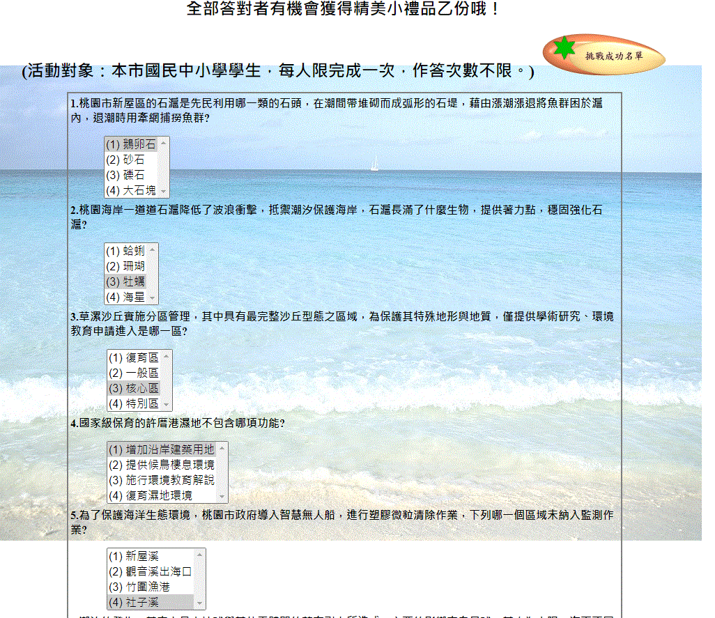 1、 請於截止日前至桃園市海洋教育資源中心網頁(https://ocean.yaes.tyc.edu.tw/TaoyuanSea)→最新公告→110學年度海洋教育有獎徵答活動(http://163.30.195.129/ocean/110award)上網填答。