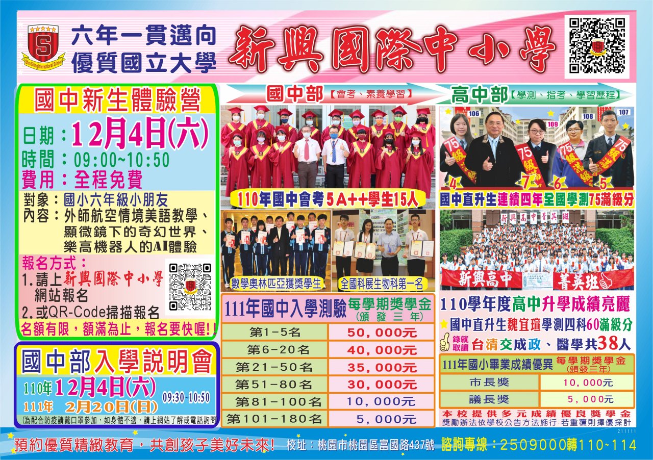 轉知新興高中111學年度國中部新生入學說明會及入學測驗資訊