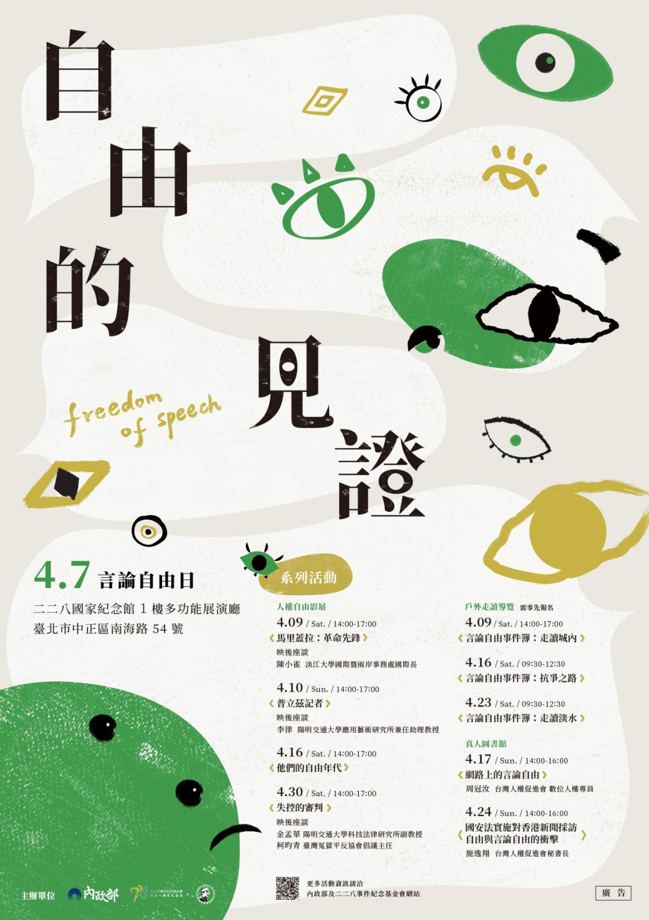 活動訂於4月9日至30日假二二八國家紀念館辦理,活動詳情請參閱內政部或二二八國家紀念館網站查詢(https://reurl.cc/jkK0vm)。