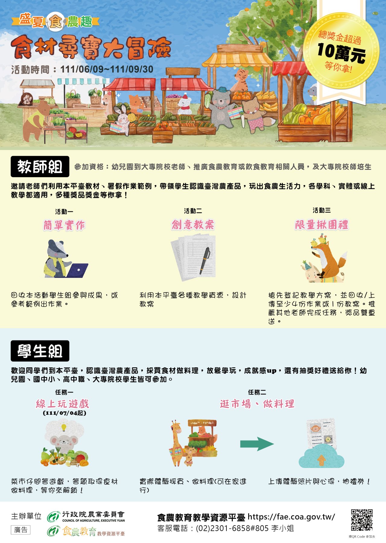 四、為使大家孰悉平臺功能,該會舉辦「盛夏食農趣:食材尋寶大冒險」活動,總獎金超過10萬元,歡迎各級學校師生、食農老師及大專院校師培生踴躍參加。