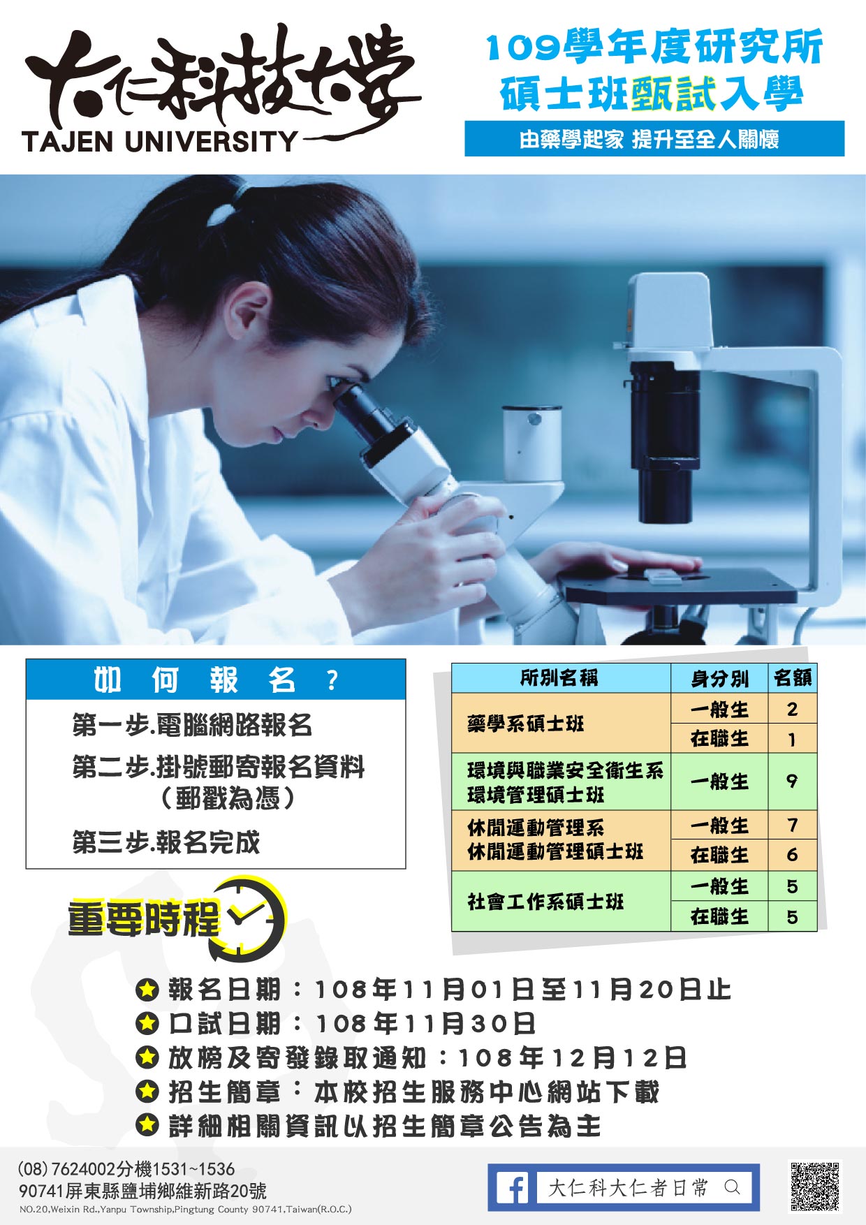 主旨:有關大仁科技大學109學年度碩士班甄試入學招生訊息一案。