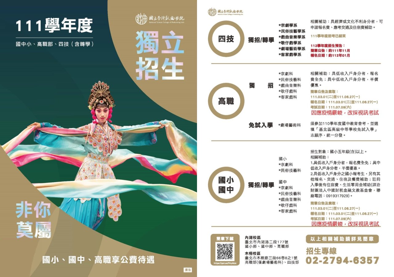 | 3、 | 高職部:京劇科、民俗技藝科、戲曲音樂科、歌仔戲科、客家戲科,僅招收高職一年級學生。 |