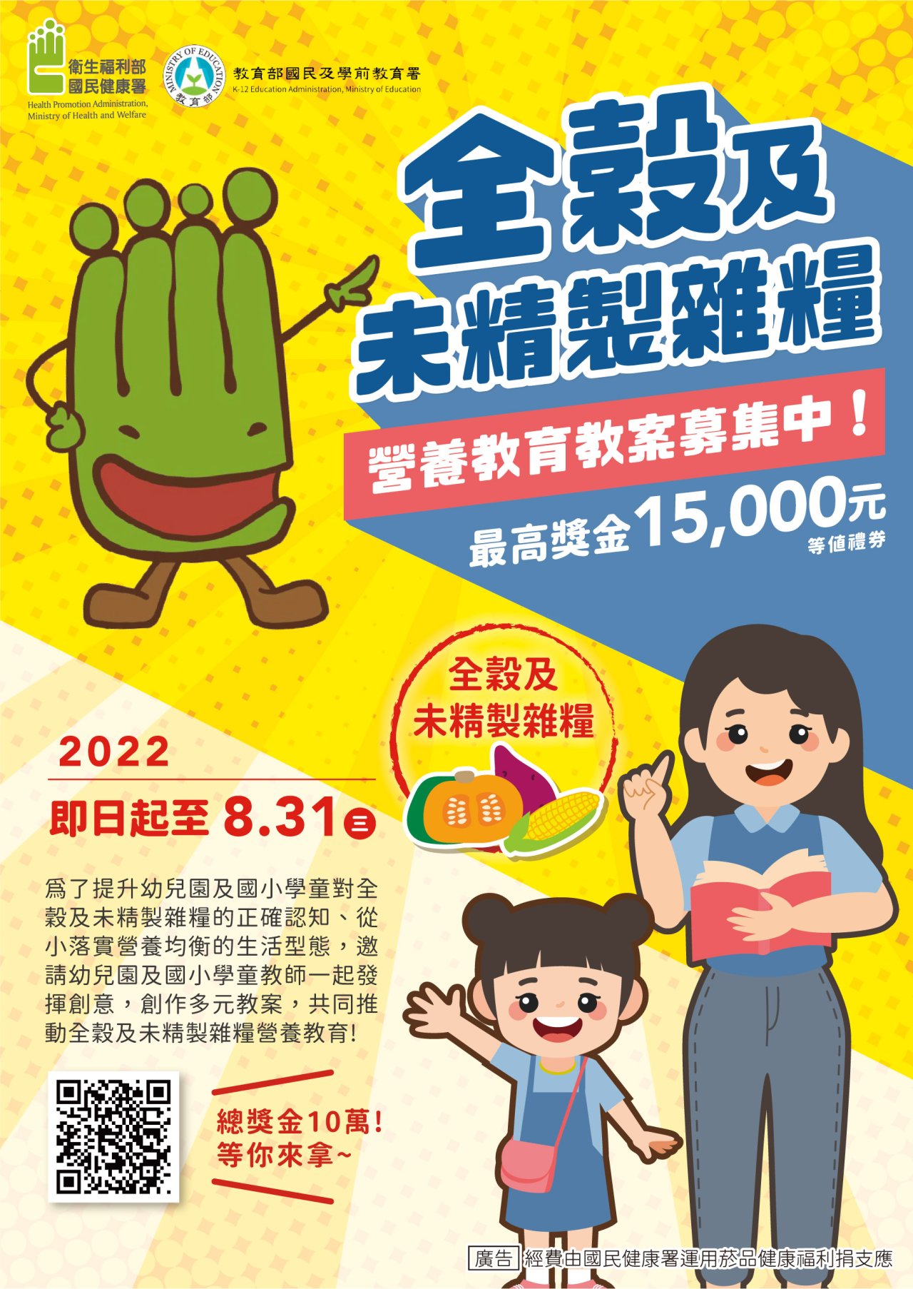 三、為鼓勵全台國小及幼兒園教職人員發展適合教學之教案及教材,以期共同推動全穀及未精製雜糧營養教育,提升孩童對於全穀及未精製雜糧知能,進而提升攝取,爰辦理「全穀及未精製雜糧教案徵件」活動,最高獎金高達1萬5,000元,歡迎國小及幼兒園教職人員踴躍參加。
