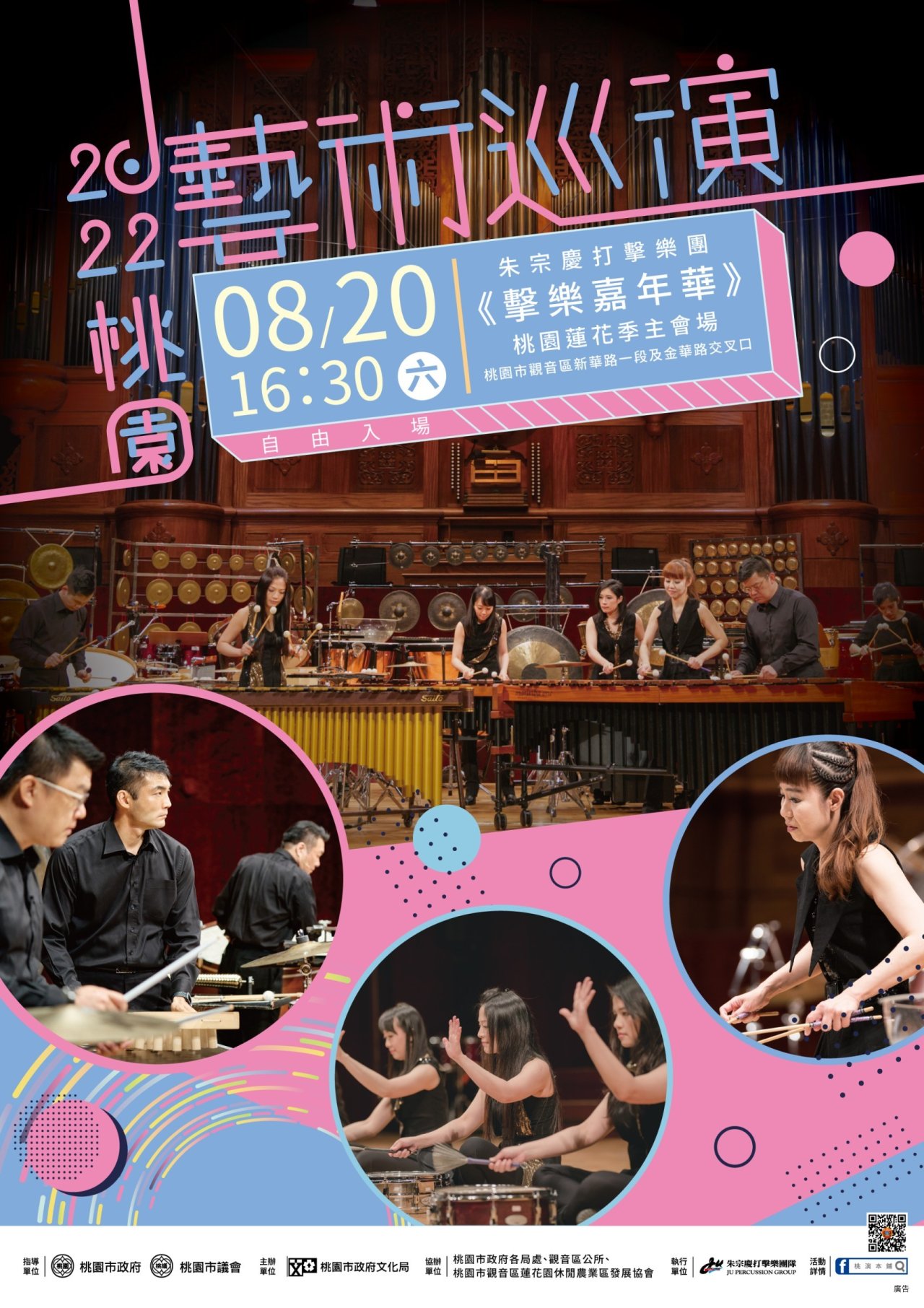 111年8月20日(星期六)下午4時30分假觀音區2022桃園蓮花季主會場(觀音區新華路一段及金華路交叉口)辦理朱宗慶打擊樂團《擊樂嘉年華》打擊樂演出。