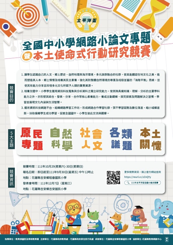 | 二、 | 為增進全國中小學生行動研究技巧與團隊合作之精神,爰花蓮縣政府辦理旨揭競賽,相關資訊如下: |