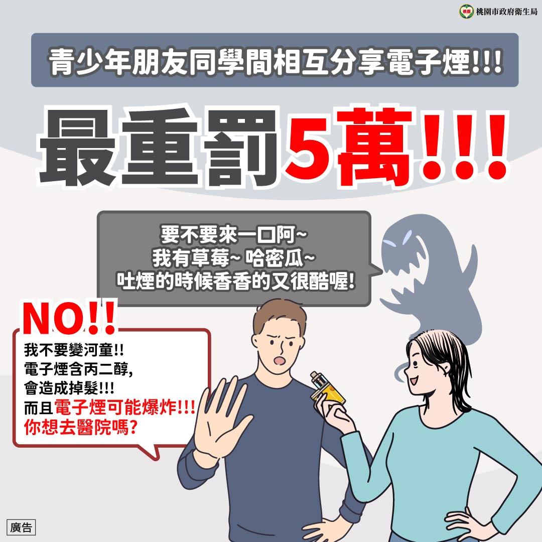 二、    為保護本市青少年免於電子煙危害及降低其使用率,本府衛生局製作「電子煙危害」衛教宣導圖卡3篇,希冀以圖象情境提升其電子煙危害相關識能,建立學生對拒菸技巧及瞭解本市電子煙危害防制自治條例。