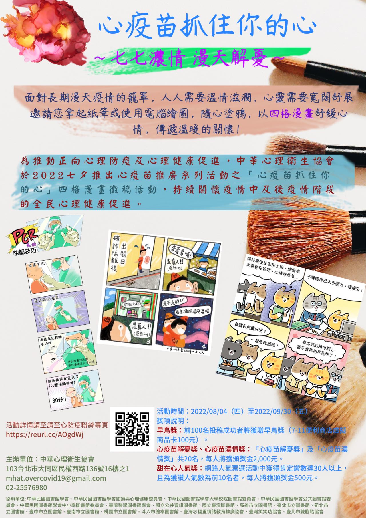 主旨: 有關社團法人中華心理衛生協會心防疫工作小組推廣「心疫苗抓住你的心」四格漫畫徵稿活動,請查照。