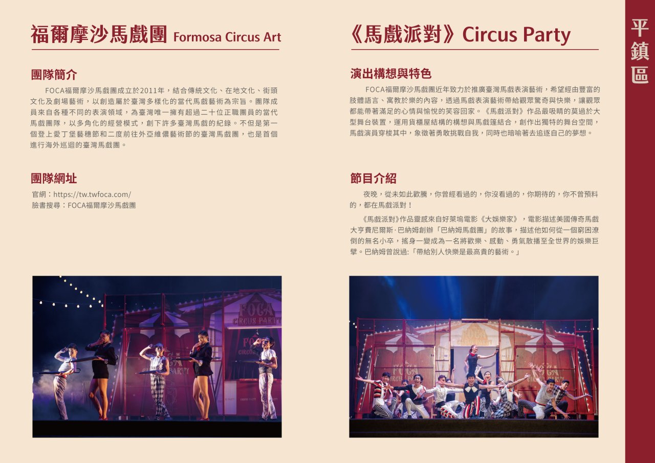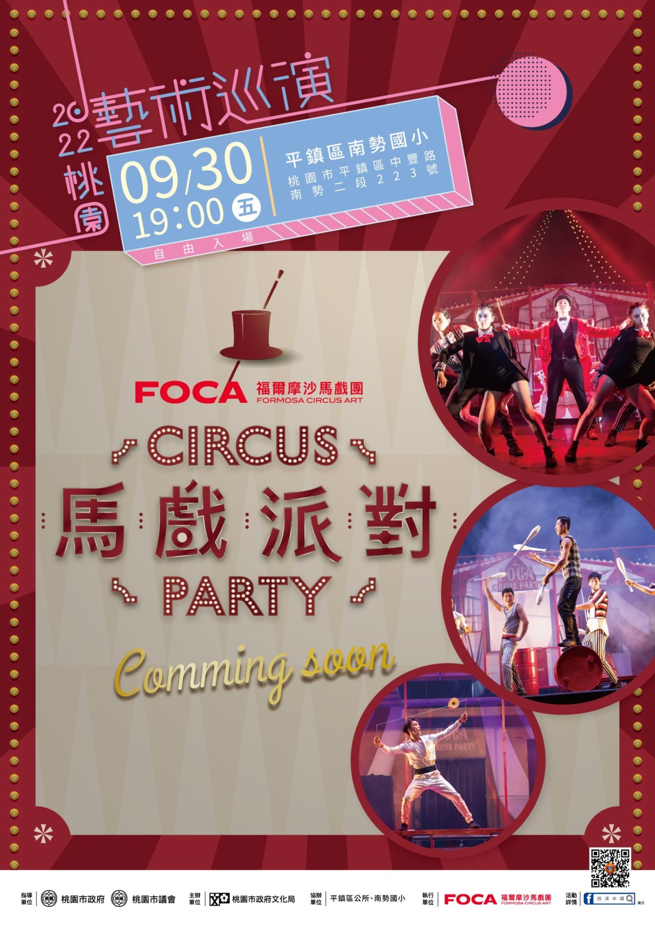 一旨案預定於111年9月30日(星期五)晚間7時至8時30分假平鎮區南勢國小(桃園市平鎮區中豐路南勢二段223號)辦理FOCA福爾摩沙馬戲團《馬戲派對》活動演出。