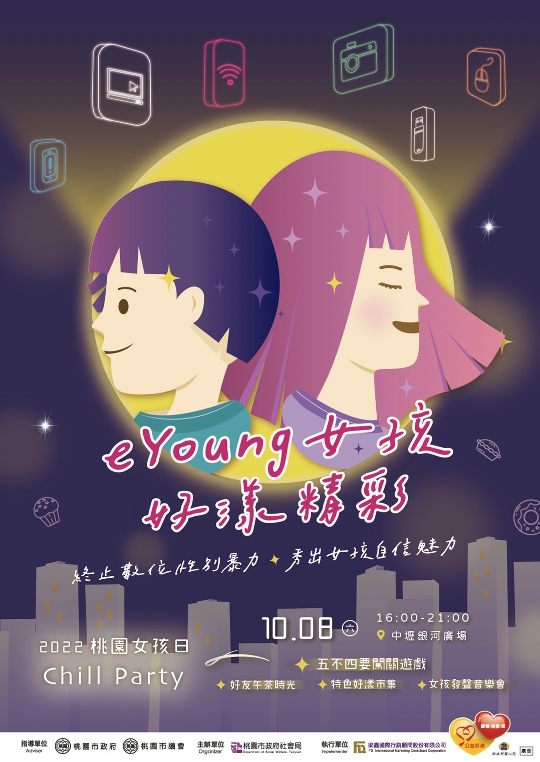 社會局訂於111年10月8日(星期六)下午4時至9時假中壢銀河廣場(中壢區九和一街35號)辦理桃園女孩日活動,現場將透過四大精彩活動(趣味闖關遊戲、好友午茶時光、特色好漾市集及女孩發聲音樂會)帶大家動起來,邀請市民朋友共襄盛舉,一起終止數位性別暴力。