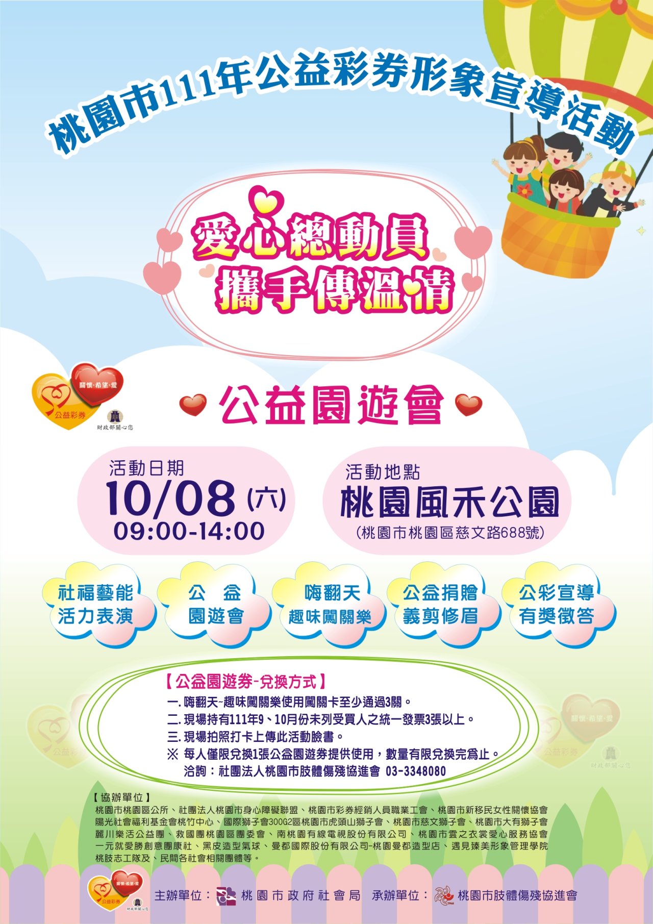 本次活動訂於111年10月8日(星期六)上午9時至下午2時,假本市桃園區風禾公園辦理,當天有園遊會、免費義剪、活動表演、公彩宣導及有獎徵答贈送溫馨小禮等豐富活動,另當天完成闖關活動、提供9、10月發票3張或活動現場拍照打卡上傳「社會局臉書」並「分享好友」,完成以上1項兌換方式,即可獲得園遊券一張,數量有限兌換完為止,歡迎踴躍參加。