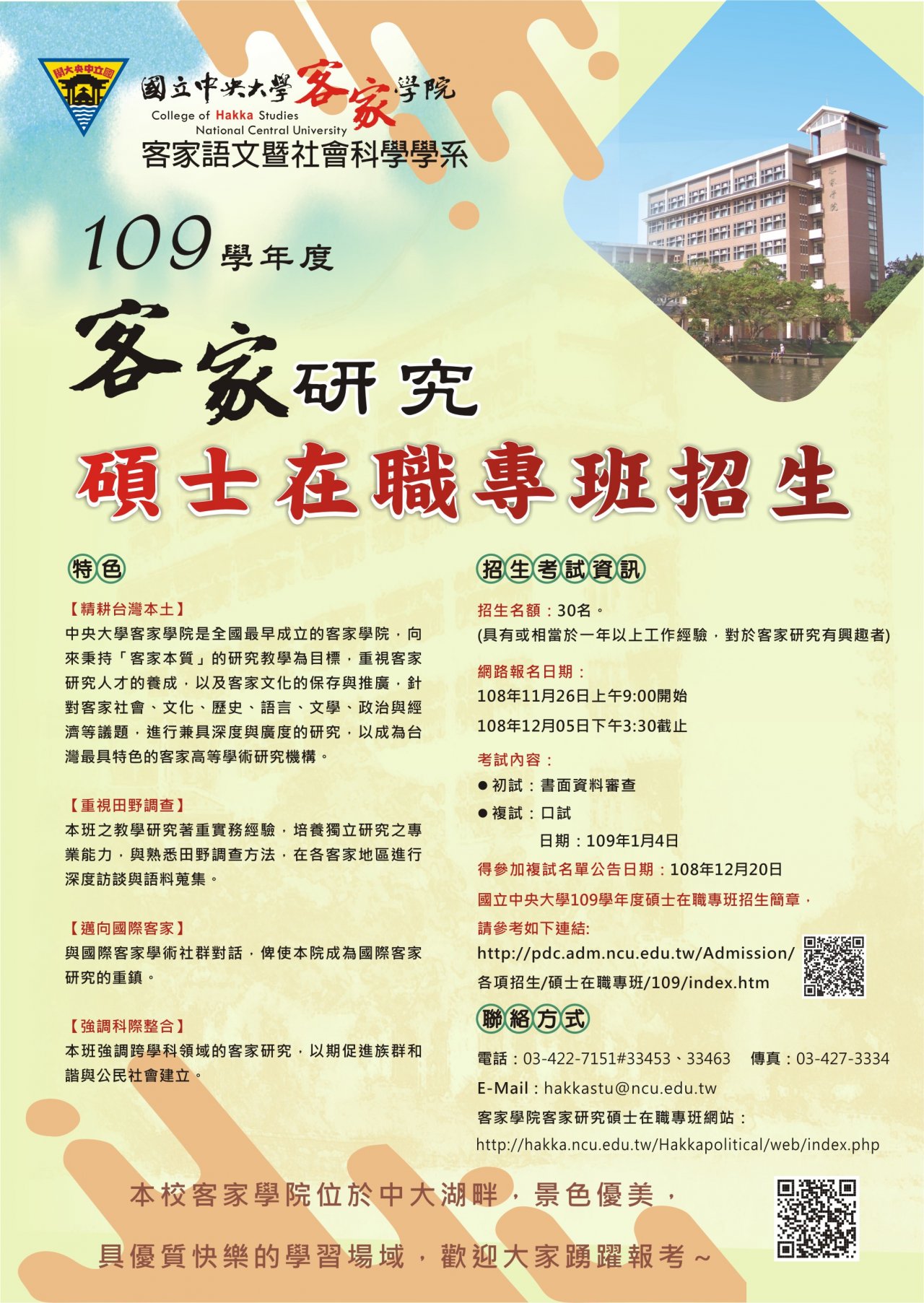 一、本校客家語文暨社會科學學系「客家研究碩士在職專班」109學年度招生,考試方式為初試:書面資料審查(免筆試)及複試:口試,招生海報如附件。