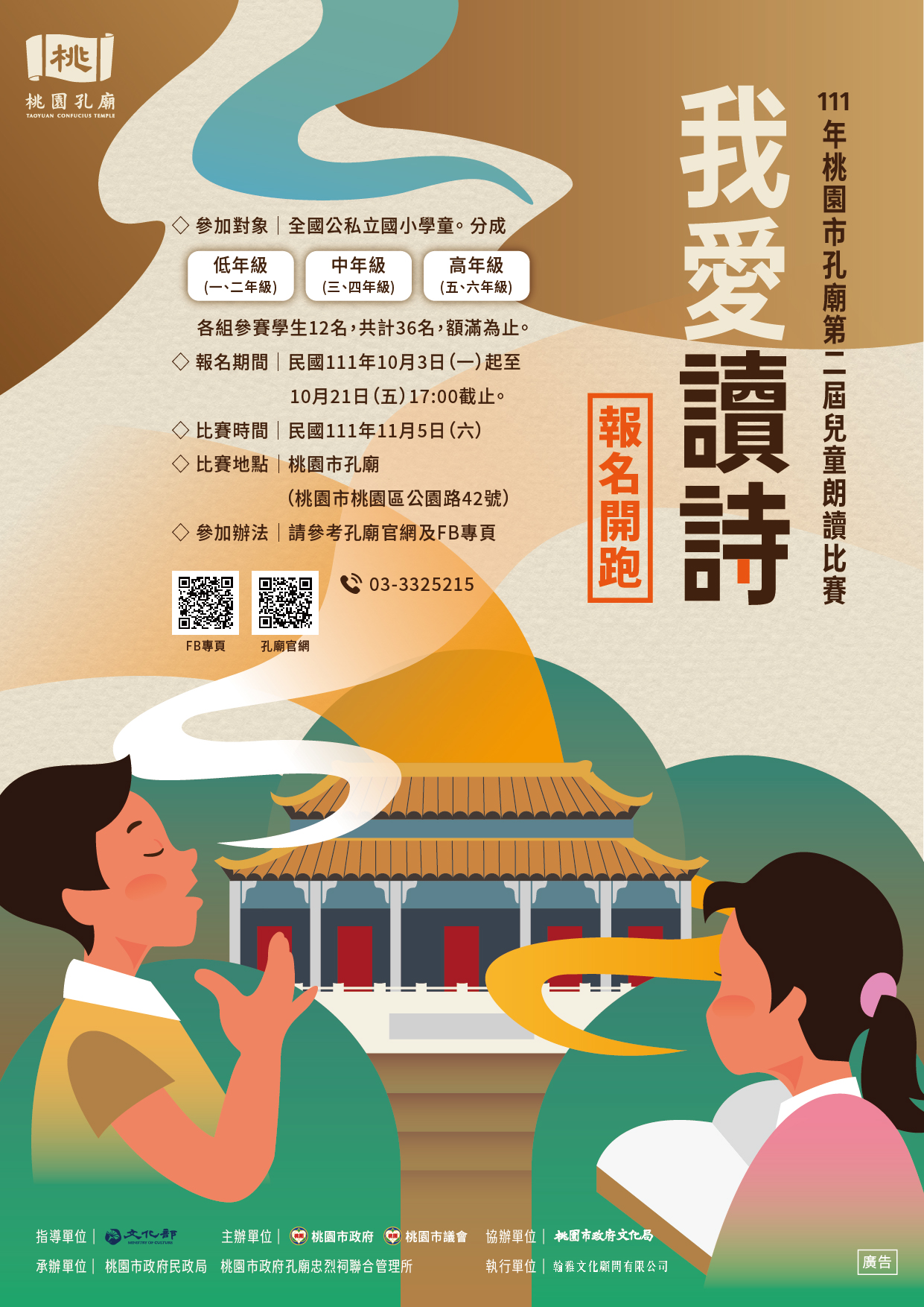 檢附111年桃園市孔廟第二屆兒童朗讀比賽參賽辦法及報名表、活動EDM供參,敬請協助列印宣傳,亦可於桃園市孔廟粉絲頁(網址: