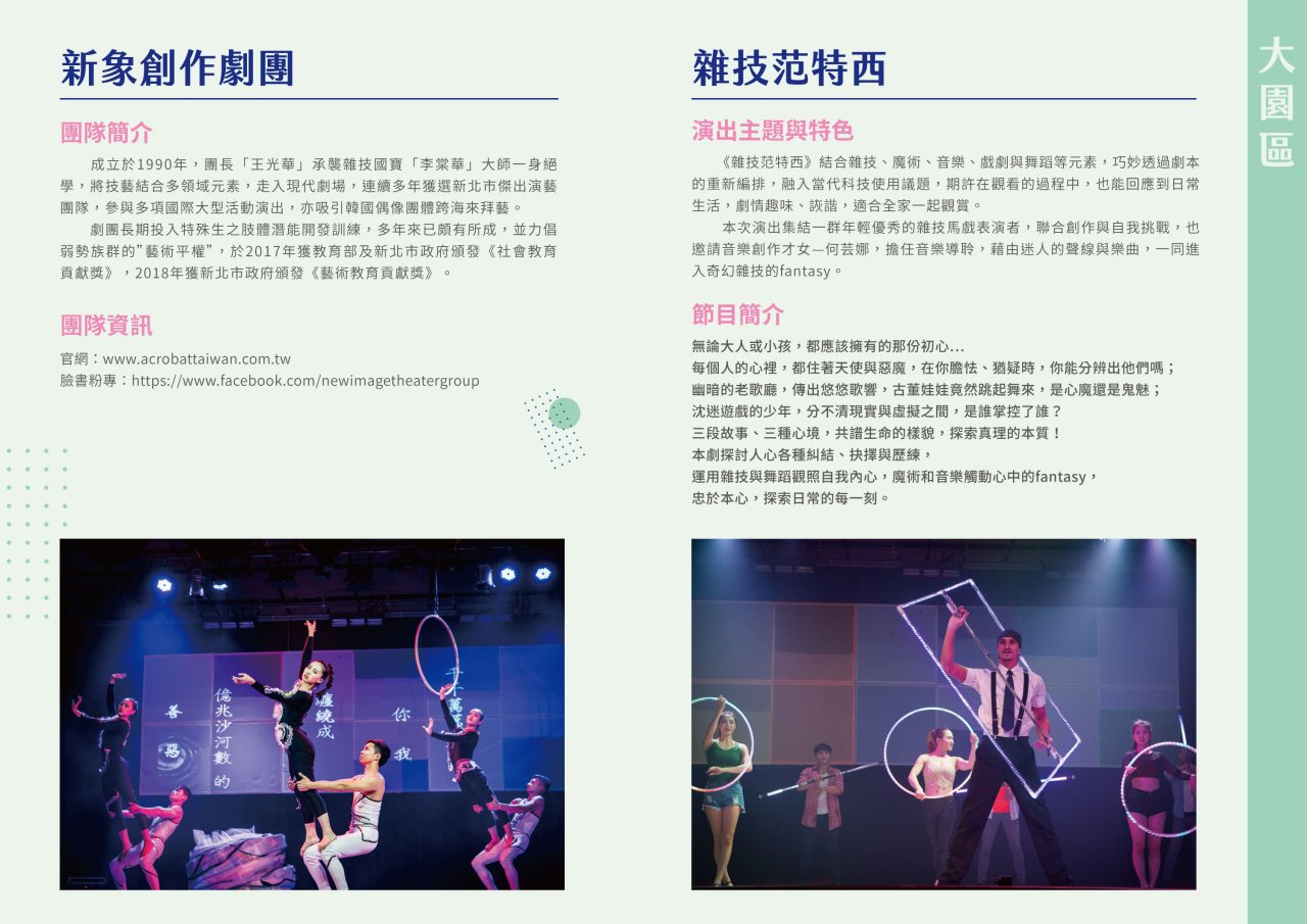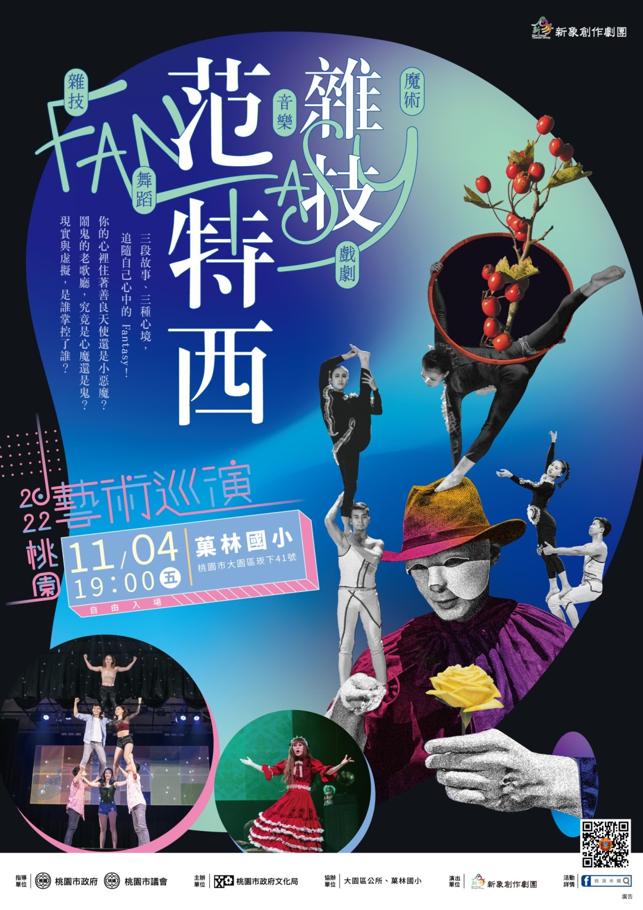 本活動預定於111年11月4日(星期五)晚間7時至8時30分假大園區菓林國小(桃園市大園區崁下41號)辦理新象創作劇團《雜技范特西》雜技馬戲演出。