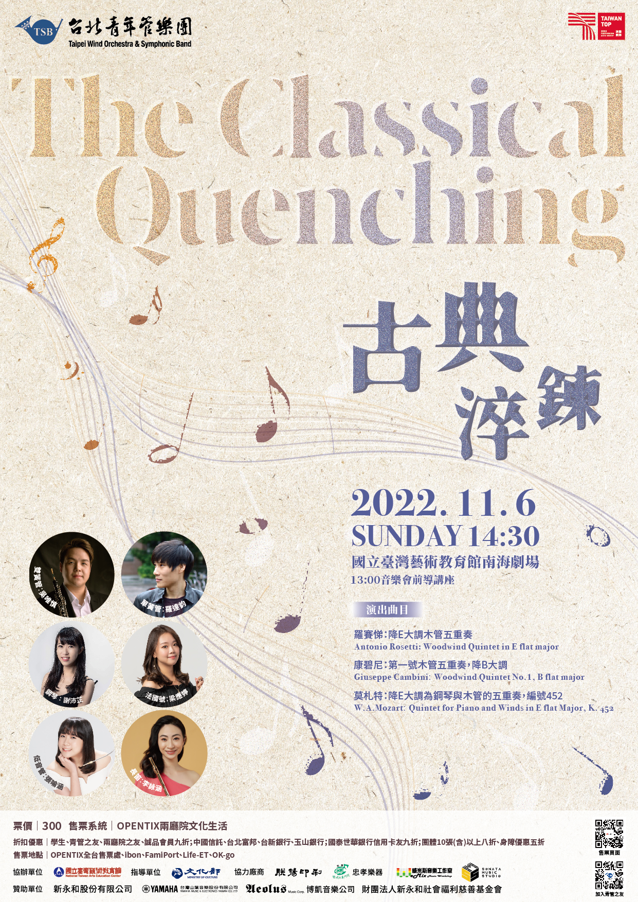 一、為使民眾了解古典時期音樂特色,本團特邀請國內優秀木管與鋼琴新秀演奏家,精選多首古典時期優美曲目,包含莫札特管樂與鋼琴五重奏及當代木管五重奏曲目。
