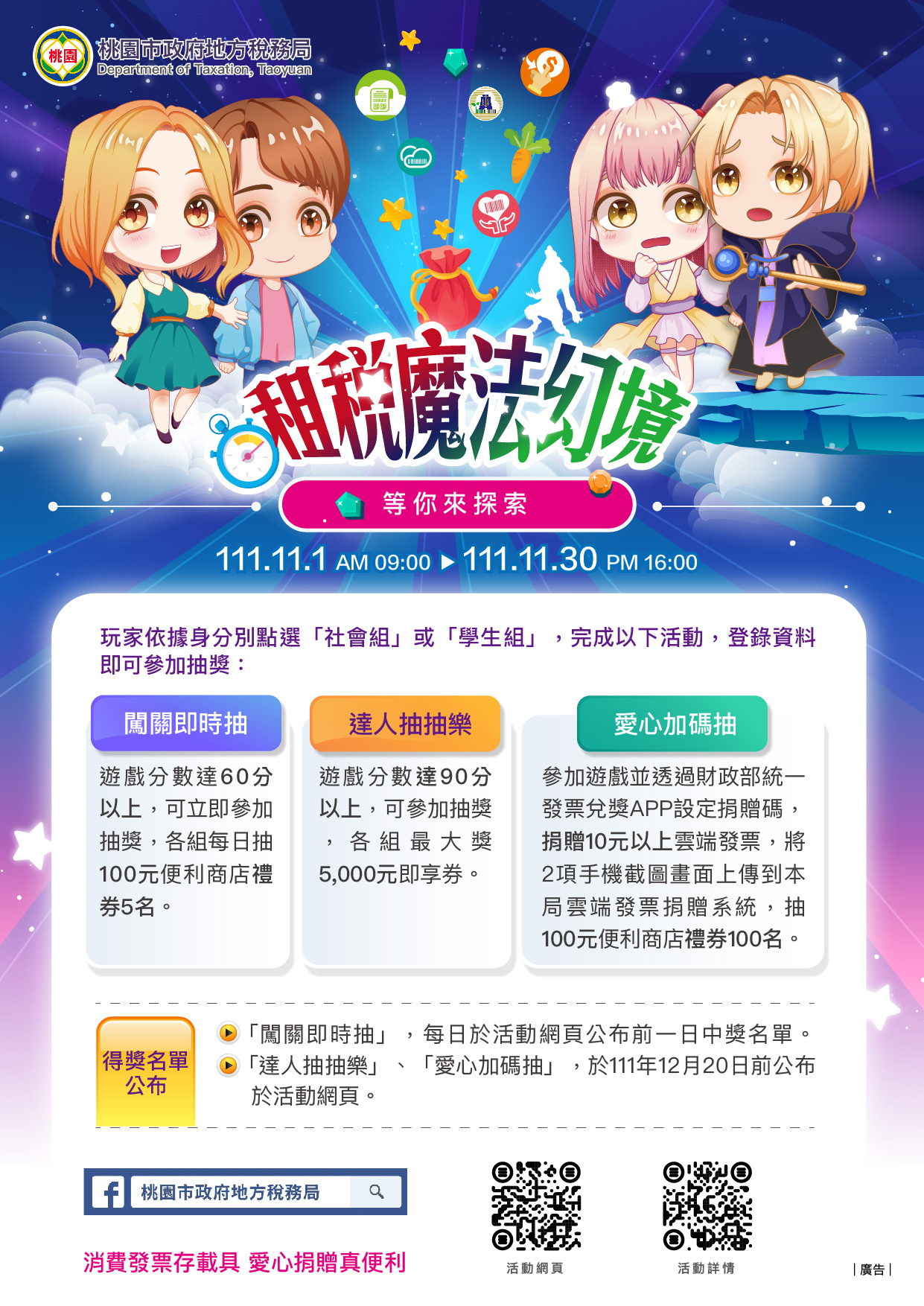 (三) 參加遊戲者,可參加「愛心加碼抽」活動,透過財政部統一發票兌獎APP設定捐贈碼並捐贈10元以上雲端發票,將2項手機畫面截圖上傳至本局雲端發票捐贈系統,抽便利商店禮券100元,於活動結束後抽出100名。