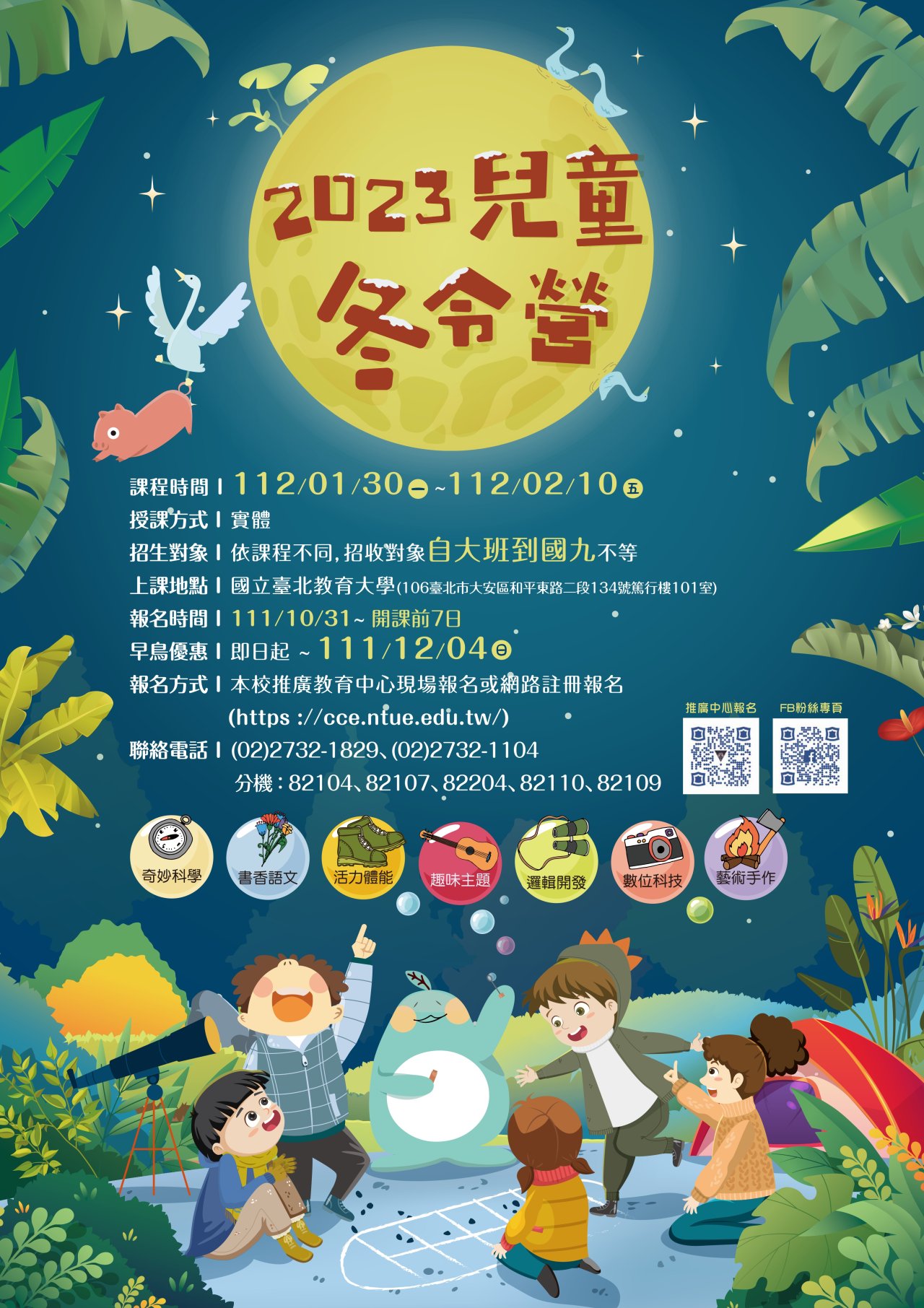 一、 旨揭「2023兒童冬令營」謹訂於112年1月30日至2月10日,課程詳細資訊請至本校進修推廣處推廣教育中心網站(https://cce.ntue.edu.tw/)查詢。