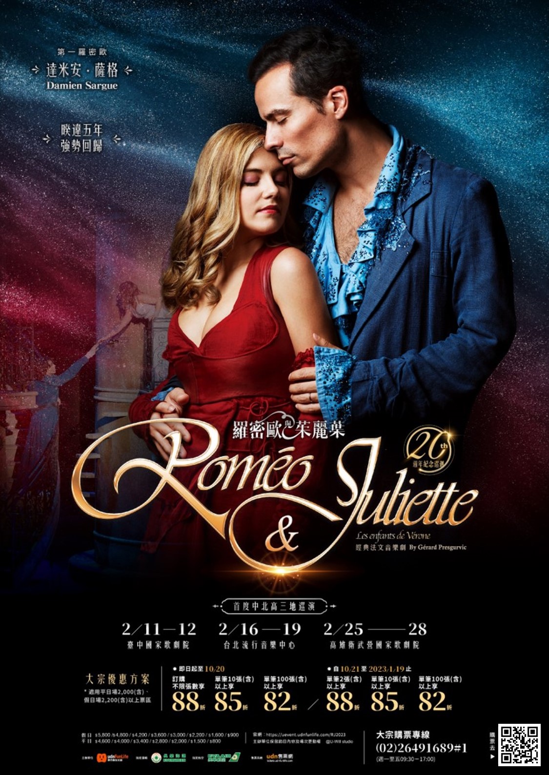 (三) 表演介紹:改編自英國文豪莎士比亞的經典作品「羅密歐與茱麗葉」,是當今唯一用「音樂劇」及「法文」形式來呈現這不朽愛情故事的創作。經典故事、融合流行及古典風格的動人歌曲,再加上高達2.5億製作費的華麗精緻服裝場景,於2001年巴黎首演後,歷經多年演出已被翻譯超過10多種語言版本,莎翁經典再次造成全球轟動!至今已累積全球超過650萬人次觀賞紀錄,奪得「21世紀最偉大的流行音樂劇」之美讚。不僅在戲劇成就上佳評如潮,劇中歌曲更登上各國排行榜冠軍,創下百萬張銷售紀錄,是您不容錯過的叫好叫座經典法文音樂劇。