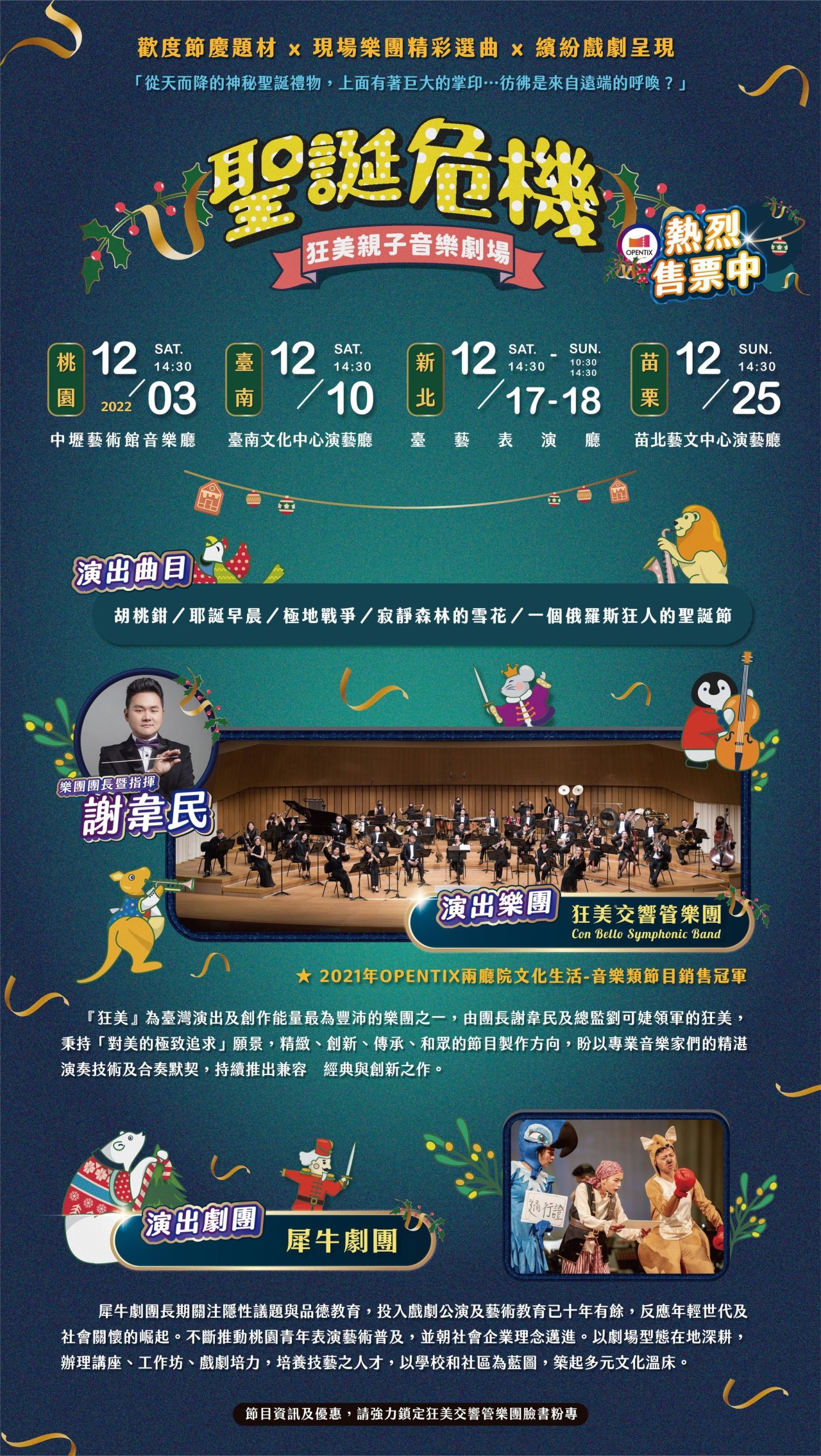 一、 節目介紹:狂美交響管樂團自2017年起,致力打造以「管樂」為基底,跨界呈現的【狂美親子音樂劇場】,所推出之精彩節目,廣受觀眾好評。本次將再度與犀牛劇團為孩子打造〝節慶感〞新作《聖誕危機》,一起探討大自然環境共存議題,盼在溫馨的聖誕佳節前夕,給孩子與父母們擁有一場溫馨美好的看戲時光。