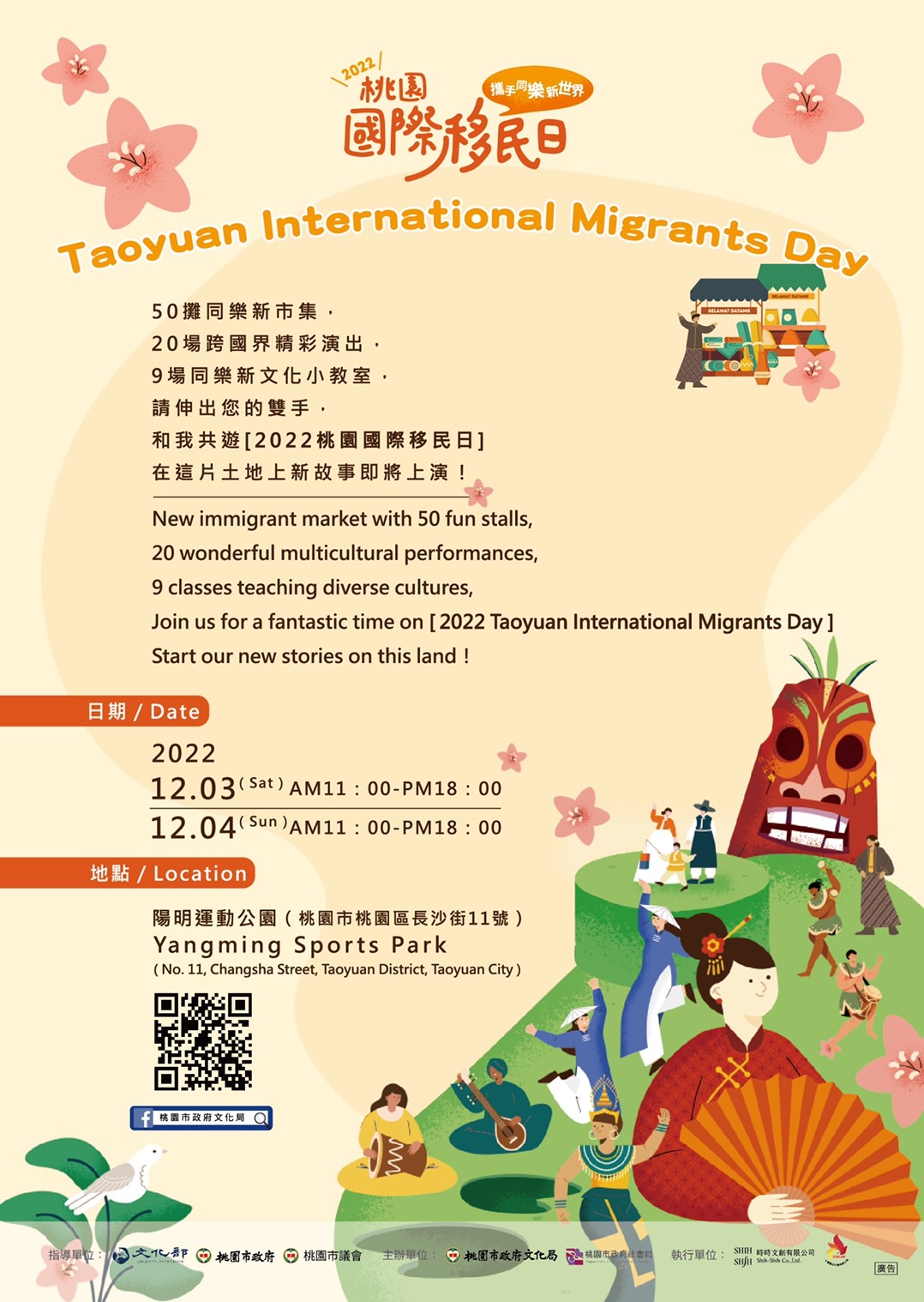 因應新住民人口成長,致力推動文化平權,於111年12月3日至4日於桃園區陽明運動公園辦理「2022桃園國際移民日」活動,共計16場國際性與在地特色兼具的精采演出,4場新住民參與其中的主題劇場,9場異國文化的互動小教室,還有40攤異國chill市集,打造桃園成為多元文化共融的友善宜居城市。
