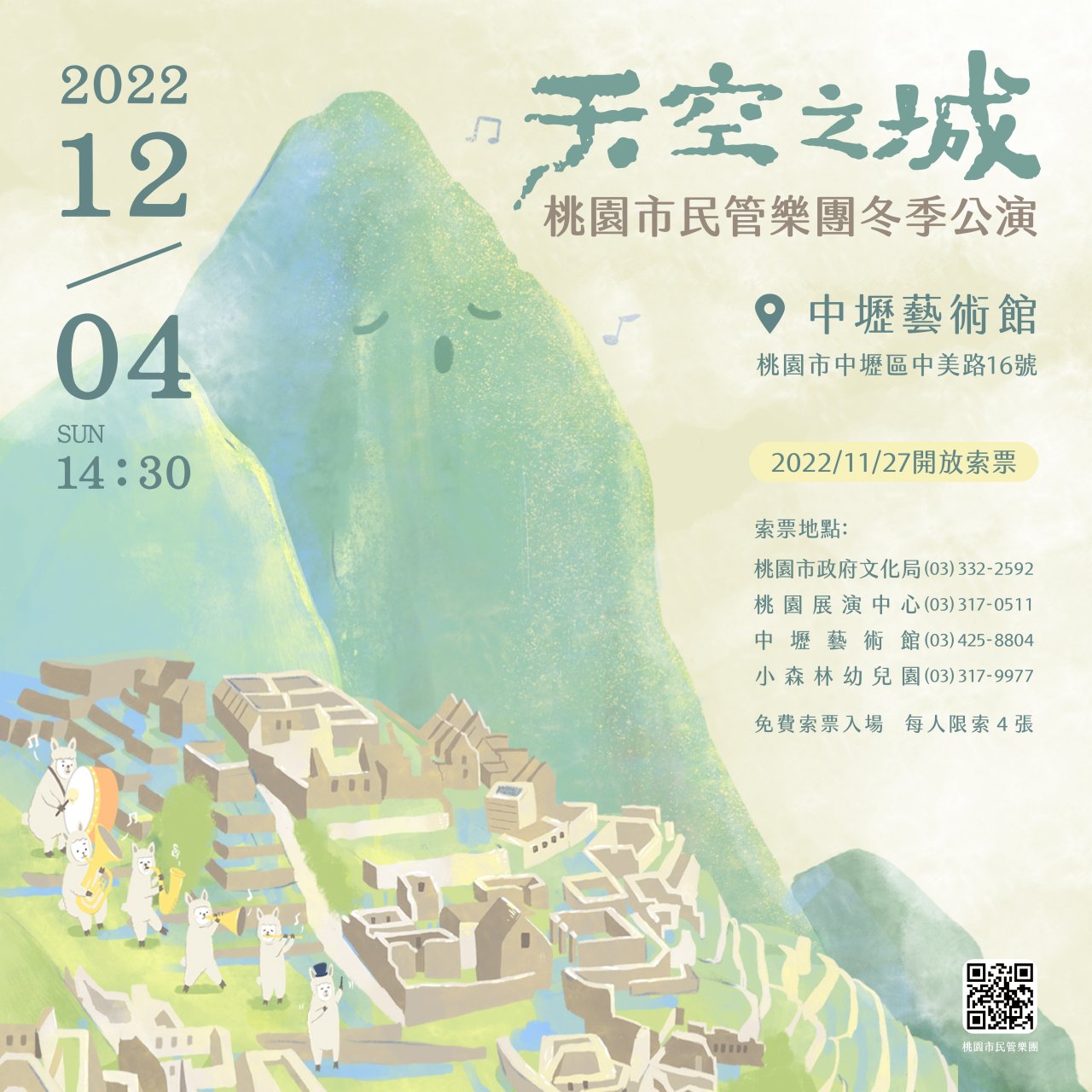 一、 活動介紹:桃園市民管樂團將於《天空之城》節目中,演繹多首經典樂曲,經典管樂曲目空中都市-馬丘比丘、莊嚴景象、光之螺旋、飛行-空中冒險,更有大家熟知的動畫配樂:魔女宅急便、風中奇緣...等,並邀請狂美銅管六重奏特別演出,期盼與各位觀眾共渡美好的午後時光。