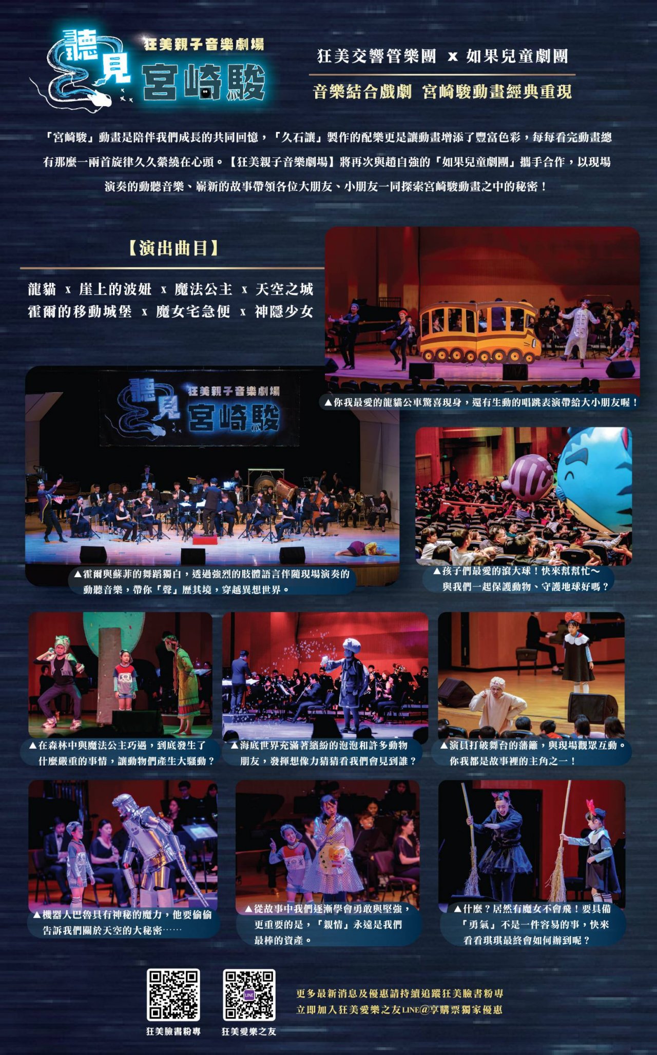 狂美親子音樂劇場《聽見.宮崎駿》將與「如果兒童劇團」攜手合作,以現場演奏的動聽音樂、嶄新的故事,帶領各位大朋友、小朋友一同探索宮崎駿動畫之中的秘密!漆黑的煤灰、可口的橡果、神奇的飛行石、古老的山獸神、裝滿海水的玻璃罐、鍋鏟上的火焰、會說話的黑貓,到底什麼能讓男主角充滿能量呢?一場充滿驚奇的冒險故事即將展開!