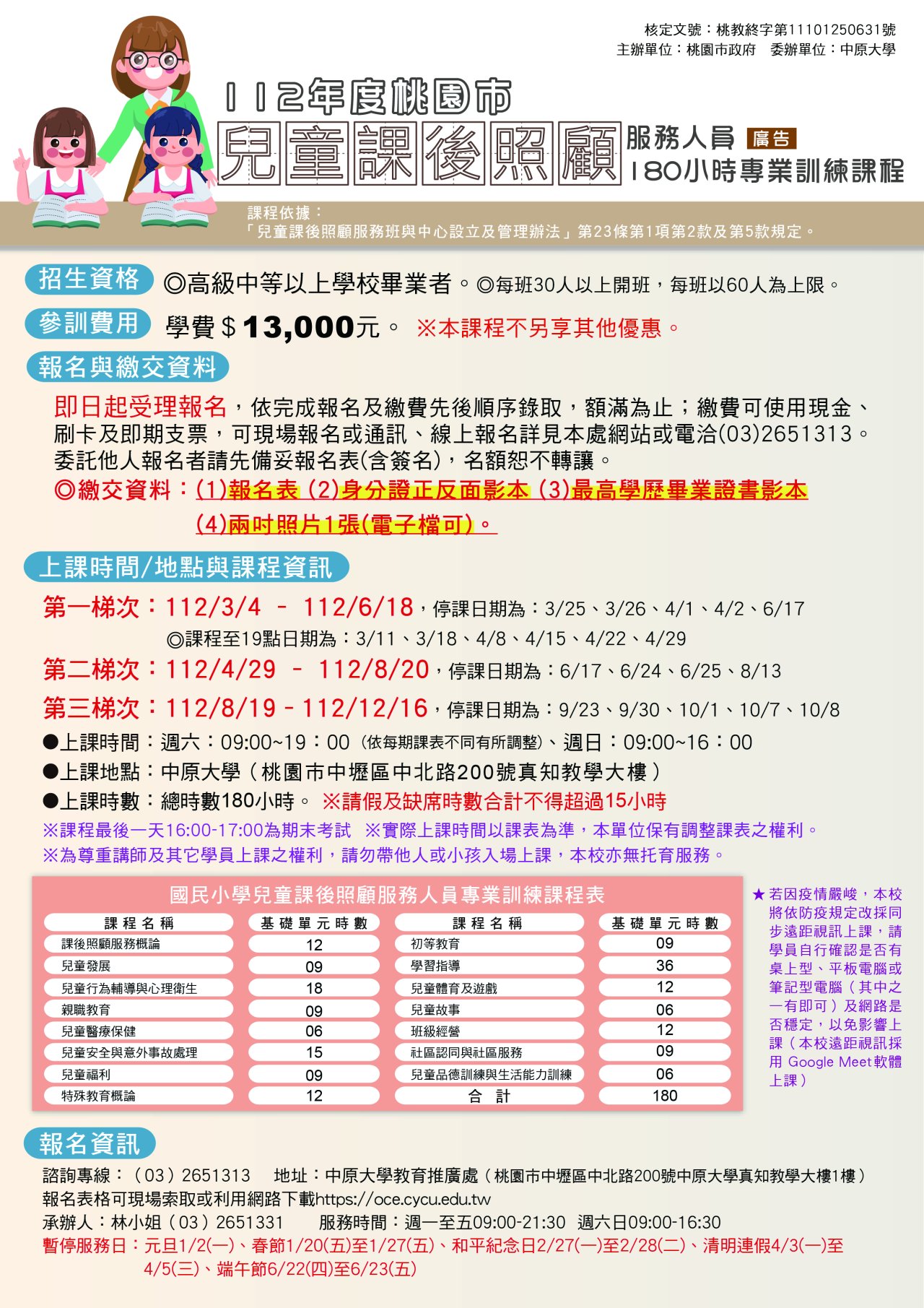 「桃園市112年度兒童課後照顧服務人員180小時專業訓練課程」簡章及報名表各1份