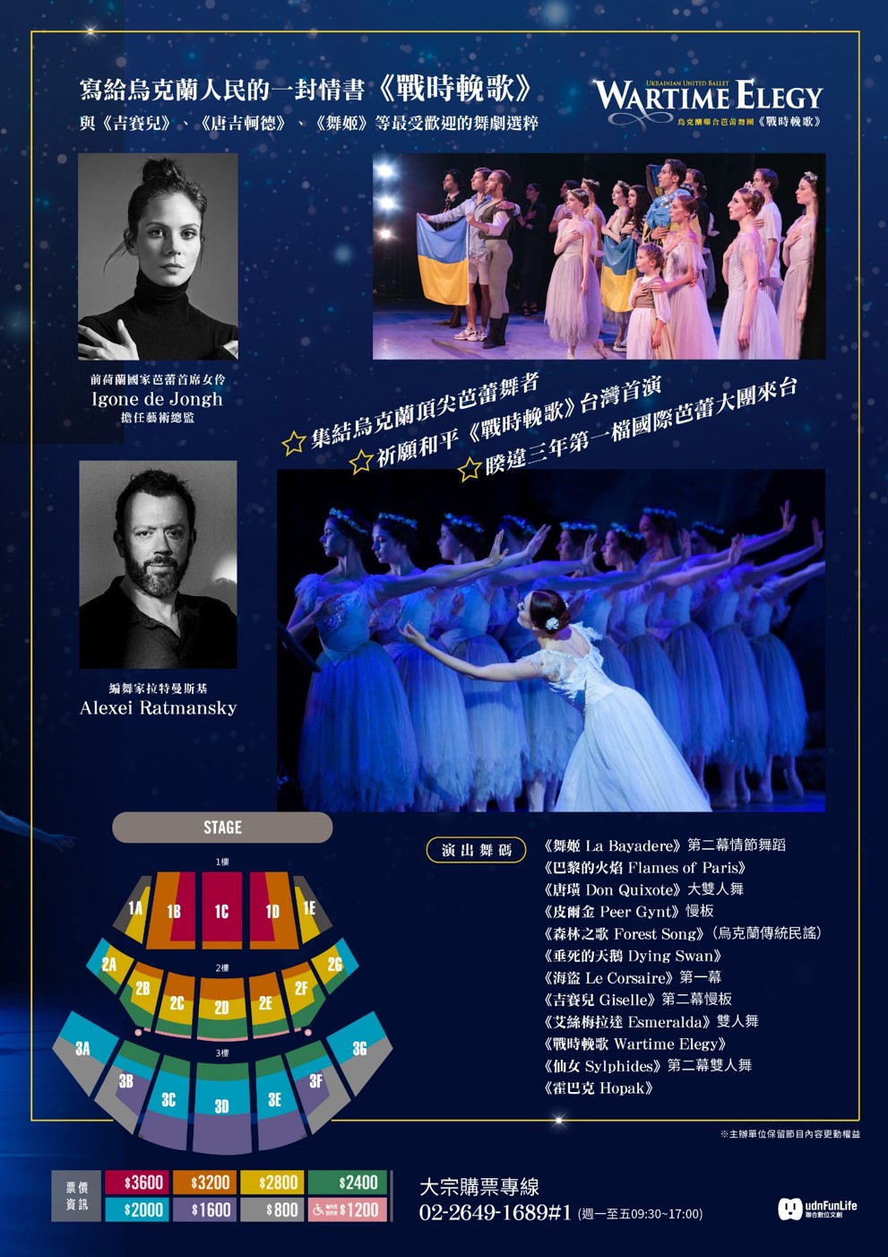 (三) 表演介紹:烏克蘭聯合芭蕾舞團(United Ukrainian Ballet)集結一群烏克蘭頂尖芭蕾舞者,他們來自於烏克蘭各地劇院與舞團,因烏俄戰爭而流離失所,最後落腳荷蘭海牙,在此重拾舞鞋,恢復日常的訓練,組成一支職業舞團,在此作為烏克蘭芭蕾舞者的戰時庇護所。2022年烏克蘭聯合芭蕾舞團陸續巡演英國、澳洲、新加坡、美國等地,所到之處票券銷售一空,感動無數觀眾,讓世人見證藝術撫慰人心的神奇力量。本次舞團將帶來《戰時輓歌》、《吉賽兒》、《唐吉軻德》、《舞姬》等最受歡迎的舞劇選粹。《戰時輓歌Wartime Elegy》是當代最重要的編舞家之一拉特曼斯基(Alexei Ratmansky)在烏俄戰爭爆發後的全新創作,但並未充滿政治訊息,相反地,他採用了烏克蘭當代最知名作曲家西爾維斯特洛夫(Valentin Silvestrov)的音樂,加上烏克蘭傳統歌曲,是拉特曼斯基寫給烏克蘭人民的一封情書,向他們堅韌不拔的精神致敬,並祈禱未來的和平。其他精采節目包括《舞姬La Bayadere》充滿動感與異國風情的第二幕;以雙手關節展現不可思議靈活度與生命力的《垂死的天鵝The Dying Swan》;挑戰男女舞者技巧極限的《海盜 Le Corsaire》第一幕;以及《唐吉軻德Don Quixote》的大雙人舞等,其32鞭轉的難度完全不遜於黑天鵝在《天鵝湖》的高潮。此外,舞團更特邀世界其他頂尖舞團的烏克蘭舞星,包括前馬林斯基首席Anastasia Matvienko與Denis Matvienko,以及英國國家芭蕾的Katya Khaniukova等人加入客席陣容,為台灣民眾帶來一場最精采的芭蕾盛宴,希望以藝術感動人心,為這個紛擾的世界帶來光明與希望。