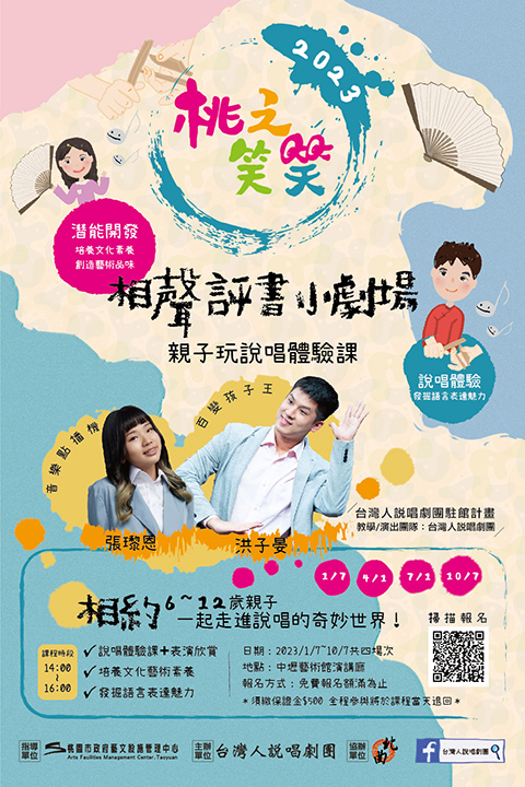 一、 本中心為推動表演團隊與演藝空間場地合作,以在地藝文扎根文目標,今年度邀請台灣人說唱劇團於中壢藝術館演講廳辦理「2023桃之笑笑-相聲評書小劇場」,透過說唱體驗課程及表演等活動,開發兒童、青少年口語表達及表演的潛力,推廣說唱藝術教育,培養藝文人才。