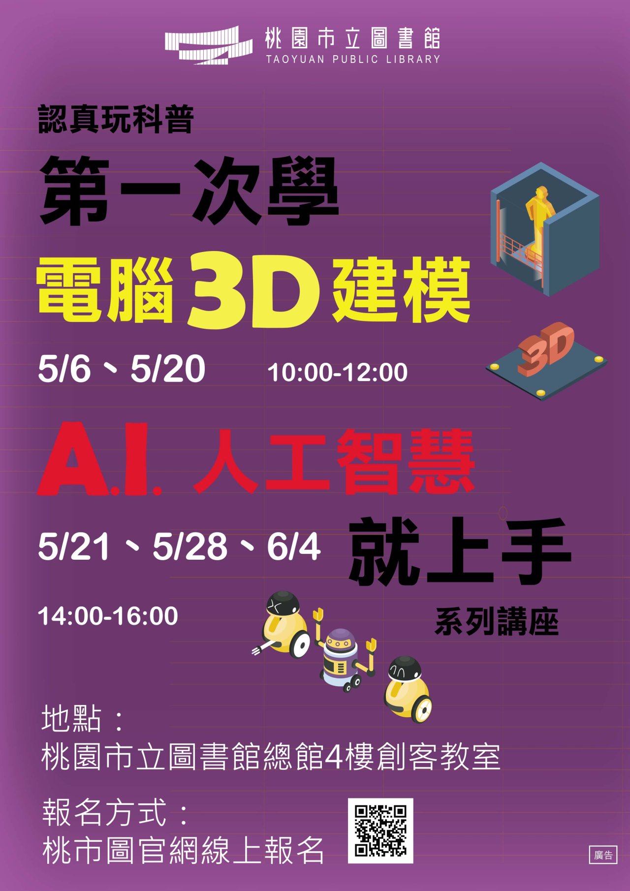 說明: 一、旨案活動於5月6日、5月20日(六)上午10時至12時,5月21日、5月28日、6月4日(日)下午2時至4時假本館新總館4樓創客教室辦理,將舉辦以基礎入門的3D建構與AI人工智慧為主題的科技系列講座,帶孩童對現在新穎的科技知識有初步了解,並知曉應用方向。 二、講座相關資訊與報名皆已公布於本館官網(https://reurl.cc/qkAorN),請貴機關協助轉知並公告訊息,如欲參加可逕至本館官網報名,至紉公誼,不勝感荷。